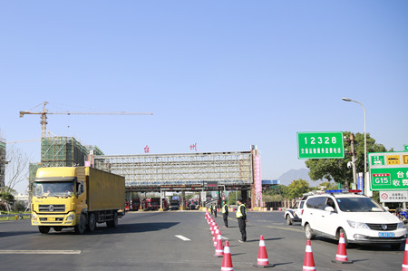 圖為高速交警臺州支隊在臺州收費站口維持交通秩序