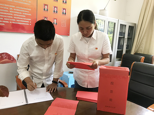 圖為投票現(xiàn)場 會(huì)議通過舉手表決方式一致通過了選舉辦法和監(jiān)票人、計(jì)票人名單。本次選舉大會(huì)應(yīng)到正式黨員11名,實(shí)到10名。經(jīng)過計(jì)票、監(jiān)票等程序,以差額無記名方式推選孫明偉、周戰(zhàn)、陳瑩三名同志為新一屆支部委員會(huì)委員。在隨后召開的支委會(huì)第一次會(huì)議上,選舉孫明偉任支部書記,周戰(zhàn)任紀(jì)律委員,陳瑩任組織宣傳委員。