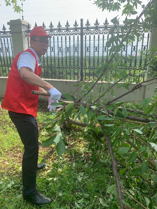 圖為志愿者合影 8月13日上午,該所志愿服務(wù)隊(duì)身穿統(tǒng)一紅色馬甲,積極投身到災(zāi)后恢復(fù)工作中。 “把砍刀給我,我力氣大,讓我來。” 活動過程中,孫明偉、杜廣勝、楊堅(jiān)等同志一行先查看了配電房周邊綠化帶,看到有樹木倒伏,壓在防護(hù)網(wǎng)上,存在較大安全隱患,他們二話不說立即手拿砍刀,對樹木進(jìn)行切割處理,并由李學(xué)平、包德福等人安排拉車將斷木等清理干凈。