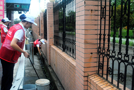 圖為員工對(duì)外廣場(chǎng)邊溝衛(wèi)生進(jìn)行清理