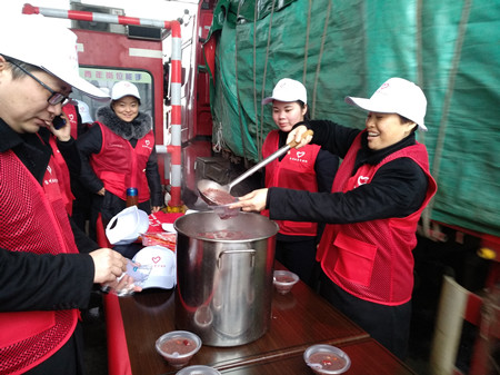 圖為志愿者忙于盛粥