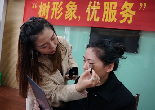 圖為員工練習(xí)化妝 通過培訓(xùn),大家掌握了妝容的基礎(chǔ)知識(shí)和化妝的基本技巧,這不僅有助于提升自我形象和精神面貌,而且帶妝上崗能夠靚化窗口形象。 楊雅芬