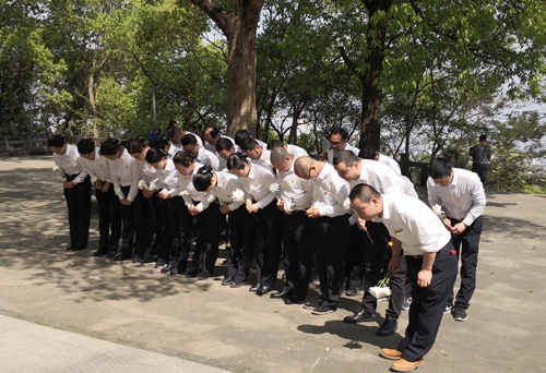 圖為敬獻(xiàn)鮮花 九峰烈士陵園始建于1956年,埋葬著20世紀(jì)50年代為國捐軀的120余位革命先烈。墓區(qū)內(nèi)青松翠柏環(huán)繞,墓前豎有一座“革命烈士永垂不朽”的石碑。上午10時許,祭掃儀式開始,全體人員懷著無比崇敬的心情向革命先烈鞠躬默哀,緊接著依次走到紀(jì)念碑前敬獻(xiàn)鮮花,表達(dá)對革命先驅(qū)的悼念與緬懷之情。在紀(jì)念碑前,全體黨員重溫入黨誓詞“我志愿加入中國共產(chǎn)黨,擁護(hù)黨的綱領(lǐng),遵守黨的章程......”