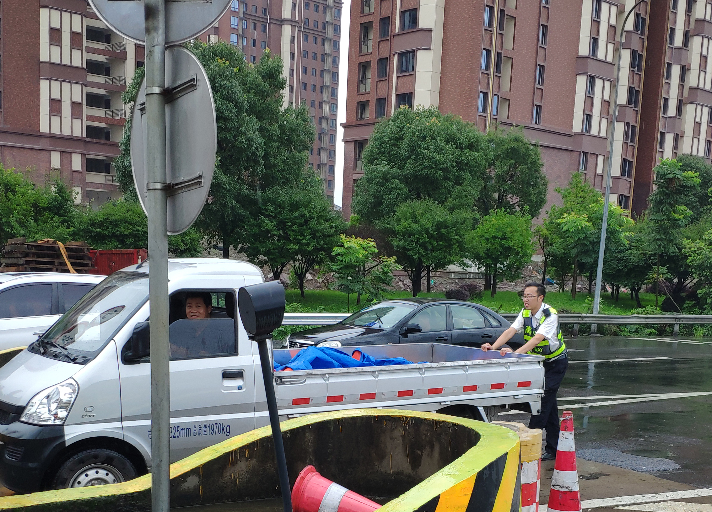 車(chē)輛故障拋錨 收費(fèi)員冒雨推行 7月4日中午12時(shí)30分左右,一輛牌照為浙開(kāi)頭的五菱小貨車(chē)停在臺(tái)州收費(fèi)所出口5號(hào)車(chē)道安全島邊上許久未動(dòng),來(lái)往車(chē)輛紛紛避開(kāi)該車(chē)道。當(dāng)班班長(zhǎng)郭斯泓發(fā)現(xiàn)這一情況后立即上前詢(xún)問(wèn),并在該車(chē)后放置隔離桶,提醒駕駛員打開(kāi)雙閃燈。