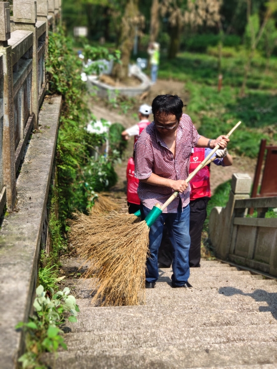 圖為打掃現(xiàn)場(chǎng) 上午8點(diǎn)半左右,志愿者們帶著掃把、鐵鍬等工具到達(dá)九峰公園,在黃巖青年志愿者的帶領(lǐng)下,來(lái)到劃分的平臺(tái)區(qū)塊。受9號(hào)臺(tái)風(fēng)“利奇馬”影響,公園內(nèi)不少樹(shù)木倒地,枯葉遍地。志愿者們帶著手套,用掃把、鐵鍬將平臺(tái)區(qū)域內(nèi)堆積的落葉和樹(shù)枝進(jìn)行裝袋清理。小的樹(shù)枝用草繩捆扎;拿不動(dòng)的樹(shù)枝,用鋸子鋸斷了抬走;鐵鍬不好裝袋,就用手去捧。烈日酷暑下,志愿者們不顧汗流浹背,經(jīng)過(guò)兩個(gè)多小時(shí)的努力,共清理出40多袋垃圾,大家用雙手還公園一片美。