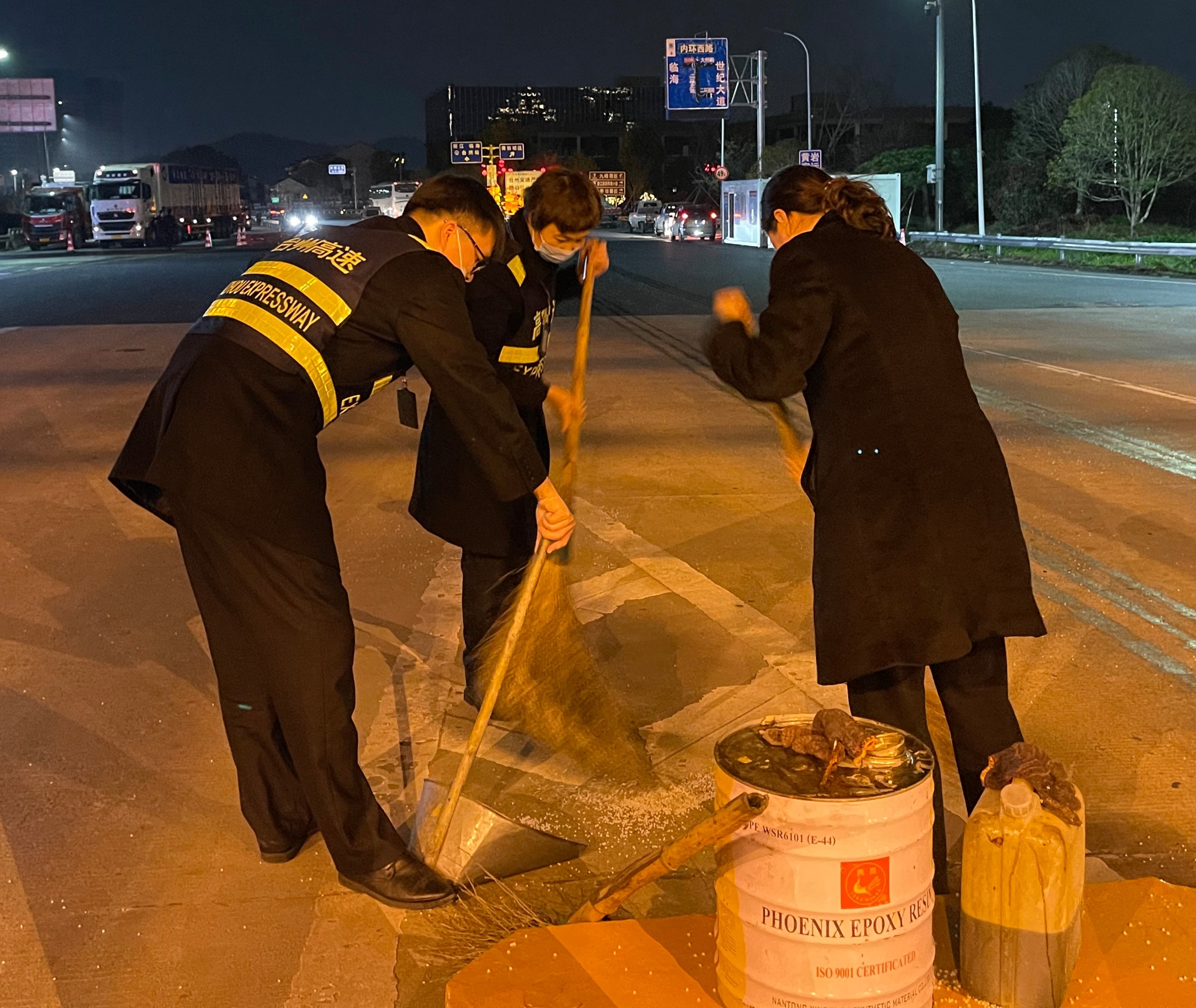 (圖為工作人員在清掃) 一時(shí)之間,車(chē)道路面上落滿大量的塑料顆粒,考慮到夜色已深,ETC車(chē)道上行駛的車(chē)輛速度大多很快,萬(wàn)一司機(jī)沒(méi)有及時(shí)發(fā)現(xiàn)前方道路上的灑落物,極易造成輪胎打滑,嚴(yán)重影響行車(chē)安全。情況緊急,為了后續(xù)通行車(chē)輛的安全,收費(fèi)班長(zhǎng)立刻關(guān)閉了該ETC車(chē)道,并放置警示標(biāo)志,然后將這一情況上報(bào)給監(jiān)控中心和收費(fèi)所值班人員。不等清潔人員到來(lái),收費(fèi)員羅時(shí)杰從車(chē)道的工具房拿出掃帚和簸箕,主動(dòng)開(kāi)始清掃工作。隨后其他不坐崗的收費(fèi)員也投入到了清掃工作中,這支臨時(shí)清掃小隊(duì)在沒(méi)有任何人的領(lǐng)導(dǎo)下自發(fā)地組織起來(lái)。這時(shí),從高速上完成機(jī)電養(yǎng)護(hù)工作的機(jī)電班工作人員正巧路過(guò),他們看到這一幕立刻將車(chē)??吭谝贿?,加入清掃隊(duì)伍。盡管散落的塑料顆粒數(shù)量較多,但在大家的共同努力下,車(chē)道終于被清理干凈,恢復(fù)了正常通車(chē)。 春日的夜晚微風(fēng)拂過(guò),已有春的暖意,而更暖的是這一幕在春夜里的一個(gè)個(gè)身影。大家因?yàn)橐患∈露墼谝黄?,然而安全無(wú)小事。所有人心系安全,為所有過(guò)往車(chē)輛保暢保安全,為臺(tái)州高速貢獻(xiàn)自己的一份力。 崔翔浩 吳侃霓