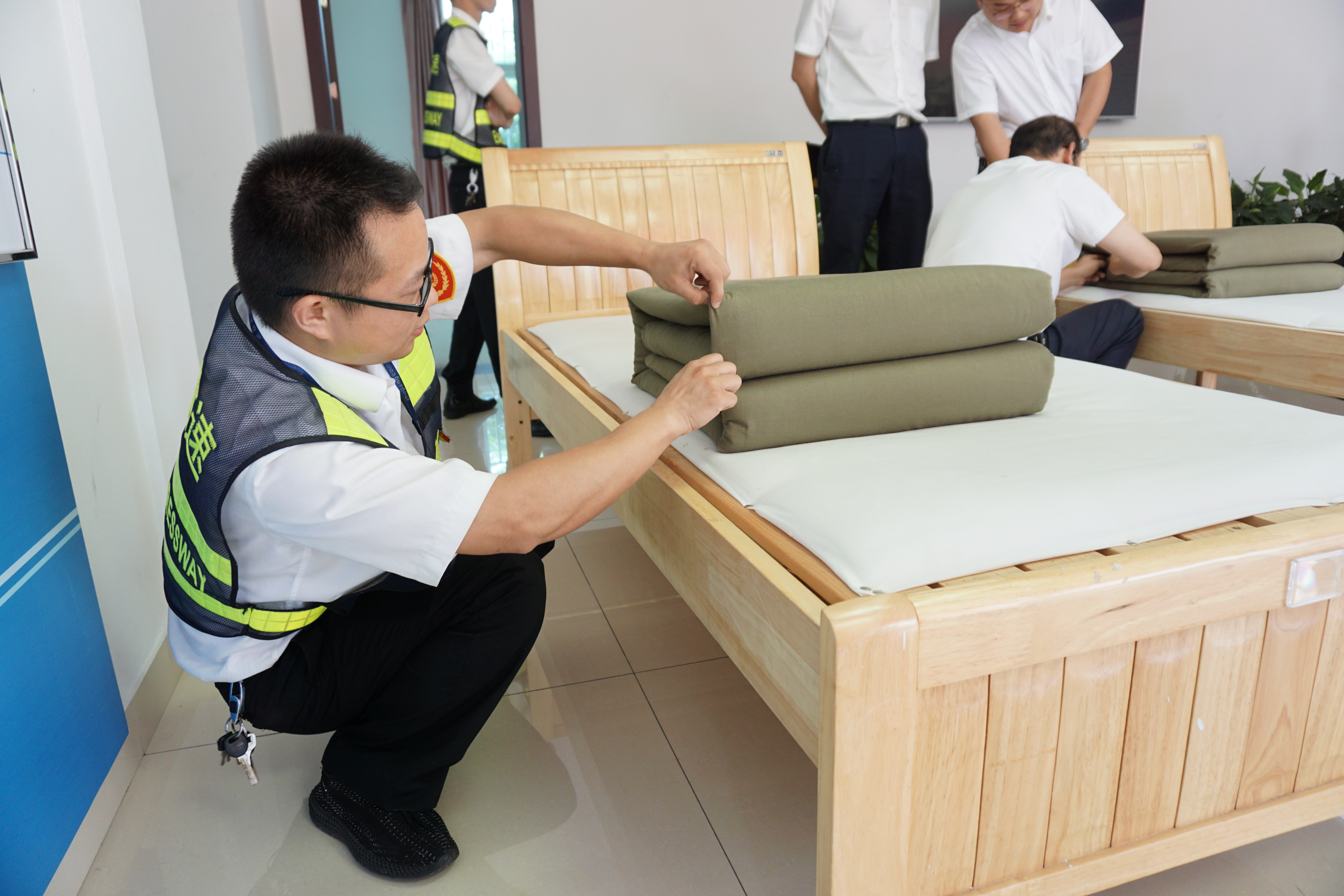 圖為比賽現(xiàn)場 活動現(xiàn)場,裁判宣布比賽規(guī)則及打分標準:評分從被子整體形狀、平整度、棱角明顯、折疊時間等方面判斷,規(guī)定在5分鐘內(nèi)完成,共設置一、二、三等獎三個獎項。內(nèi)務半軍事化在該所已是常態(tài),參賽選手們很快進入狀態(tài),從鋪到疊再到整,駕輕就熟,均能在規(guī)定時間內(nèi)整出“豆腐塊”。評委現(xiàn)場進行點評和打分。經(jīng)過競逐,最后副站收費四班何翊平奪得一等獎。比賽分四輪進行,且全程用時不到1個小時。