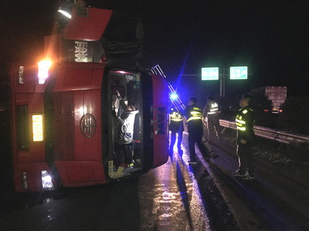 當(dāng)晚7:20,一輛車牌豫QB3**0半掛車從溫州方向過來下高速時,捆綁貨物的繩索突然斷開致使貨物傾斜。當(dāng)班收費員發(fā)現(xiàn)此情況后立刻報告班長,班長一邊報告監(jiān)控中心及所領(lǐng)導(dǎo),一邊趕到事發(fā)位置查看情況,透過卡車前擋風(fēng)玻璃,發(fā)現(xiàn)駕駛員被困在車頭里,無法脫身。聞訊趕來的所值班領(lǐng)導(dǎo)與員工一起設(shè)法找來梯子營救起被困駕駛室的駕駛?cè)藛T,所幸被救人員無大礙。然而因溫嶺西收費站車流量大,事故發(fā)生后,導(dǎo)致杭州寧波方向下高速車輛無法通行,引起主線長達兩公里擁堵。為了保障暢通解決大量車流滯緩問題,所值班領(lǐng)導(dǎo)與非當(dāng)班收費員一起放棄休息到事故后方引導(dǎo)車流,使得原本堵死的內(nèi)廣場具備了一定通行能力,這給后續(xù)施救創(chuàng)造了重要條件。