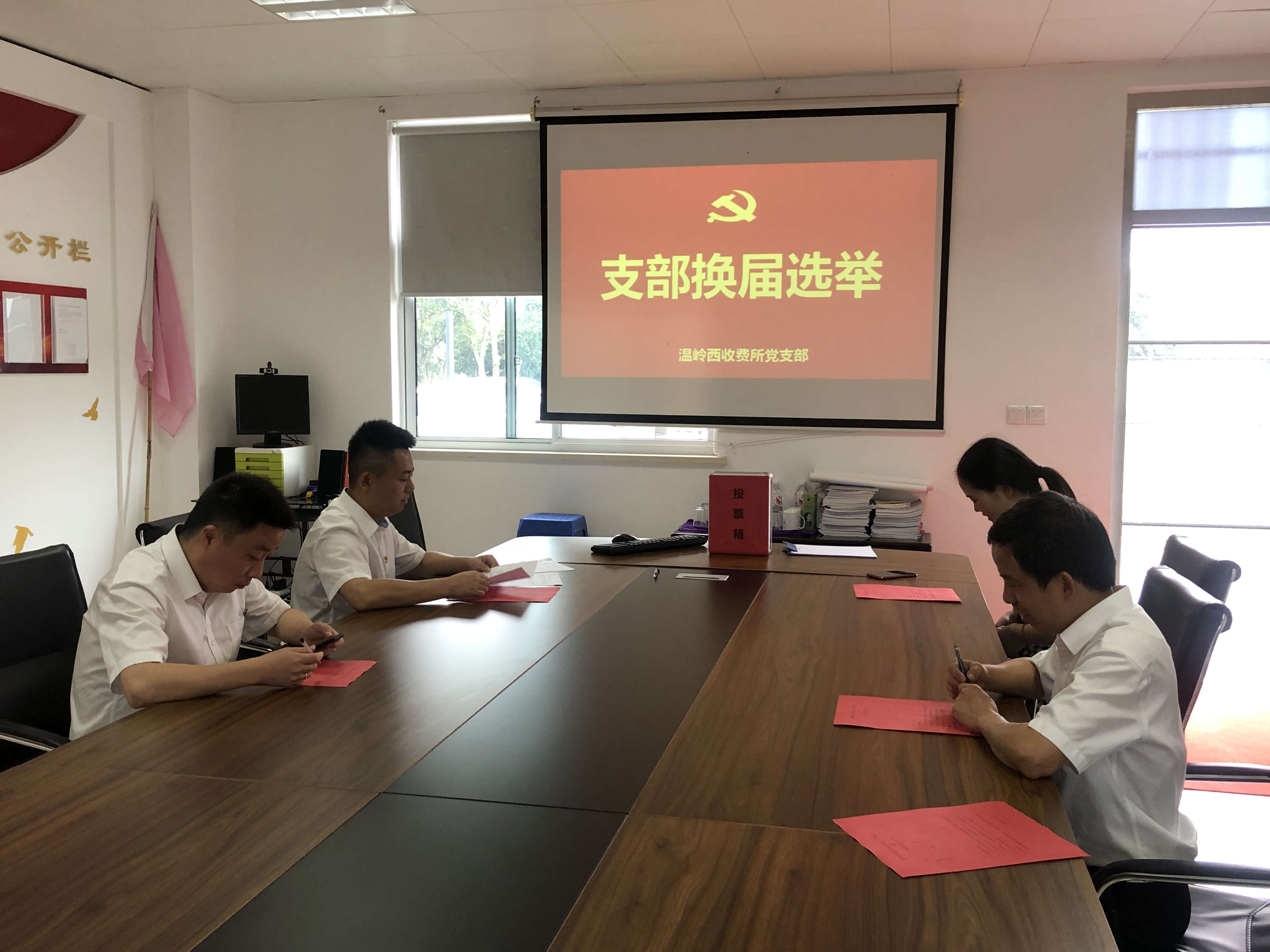 溫嶺西收費(fèi)所黨支部開展換屆選舉工作 6月11日上午,溫嶺西收費(fèi)所黨支部在所會議室召開黨員大會,開展換屆選舉工作,支部全體黨員參加會議。