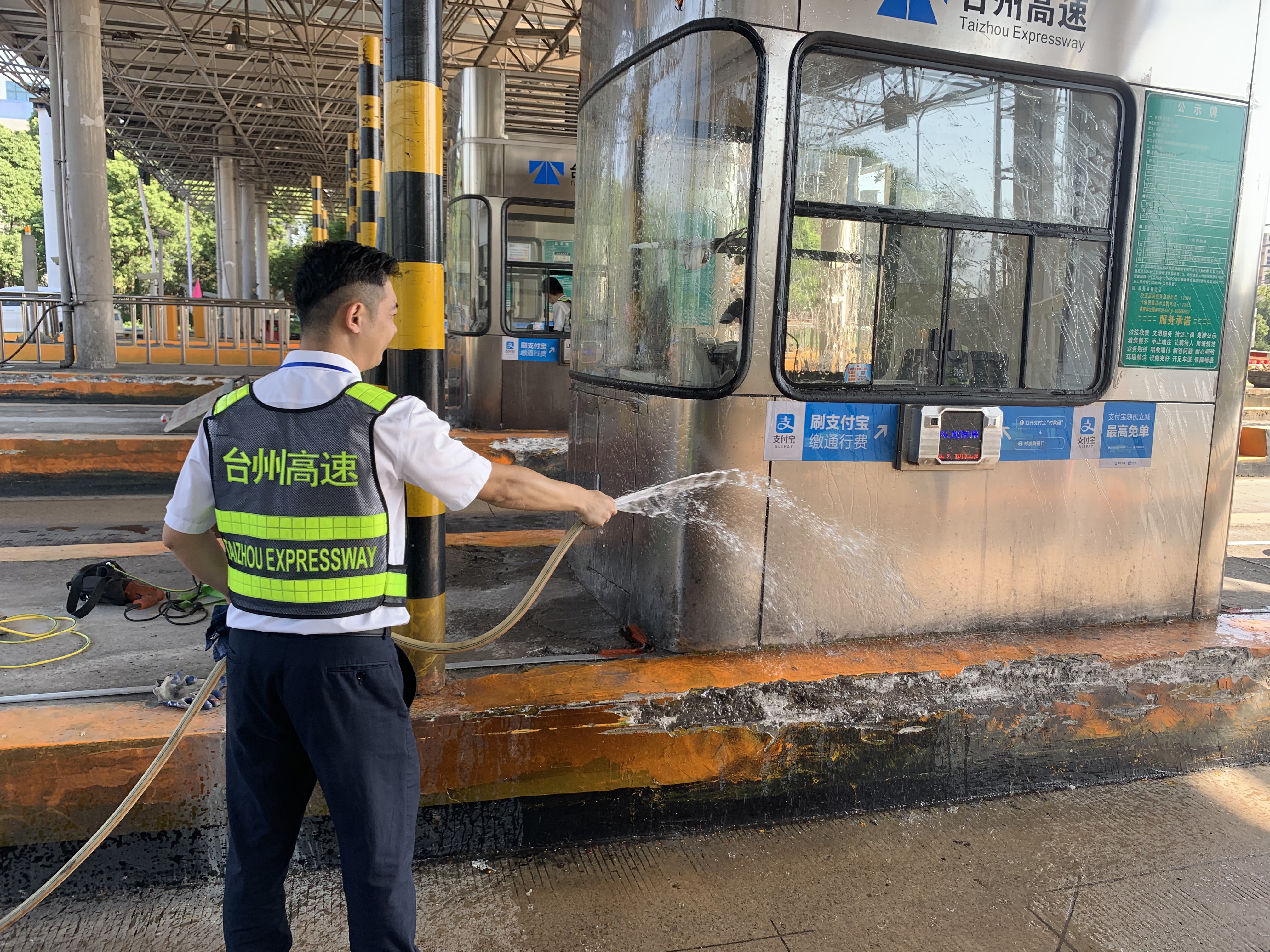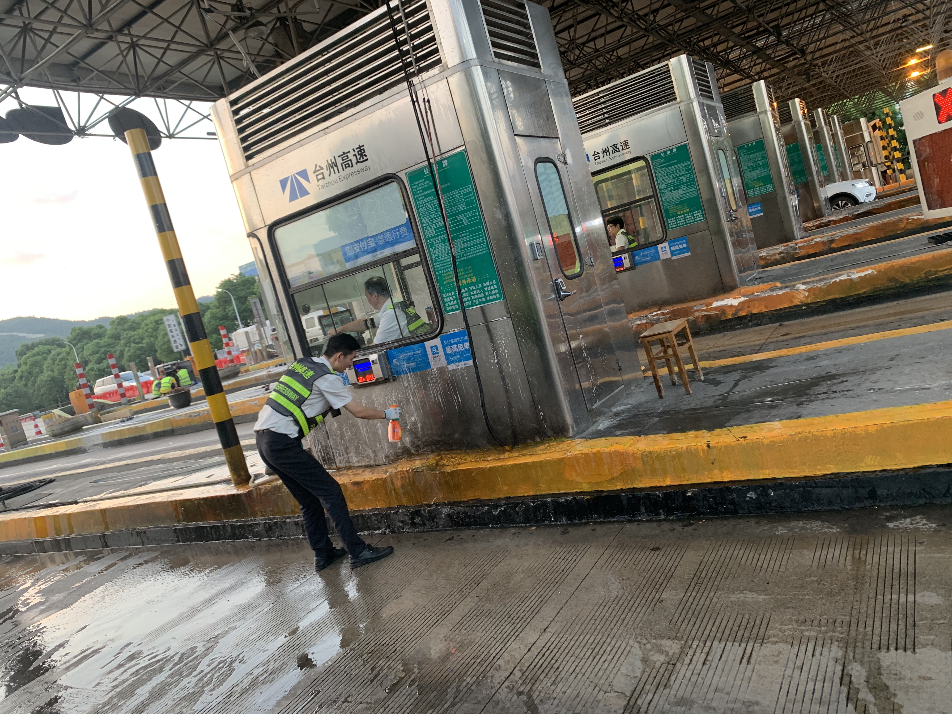 圖為工作人員打掃車道衛(wèi)生 此次環(huán)境衛(wèi)生大掃除本著徹底清理、不留死角的原則,以班組為單位,細分責任區(qū),明確保潔要求,限時清理,全所員工充分發(fā)揚不怕苦、不怕累的精神,重點對收費站內外廣場、車道、崗亭、島頭、邊溝、標志標牌等區(qū)域及設施設備進行了一次深度清潔。