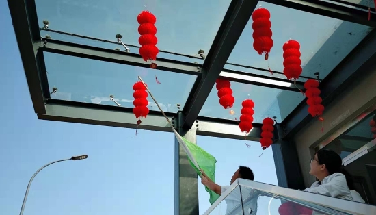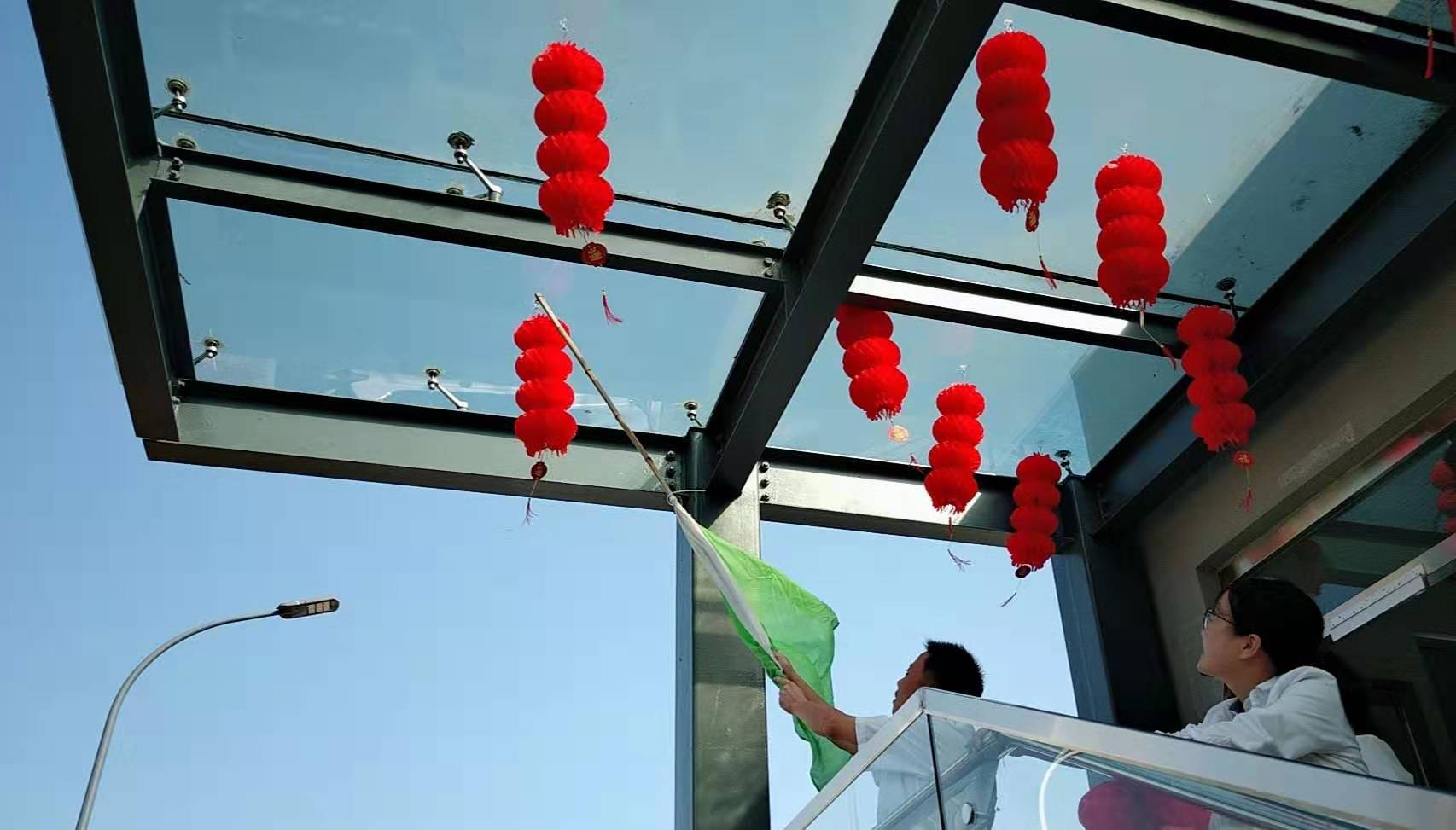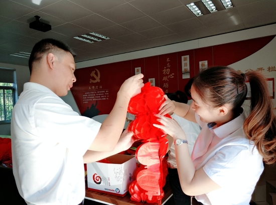 圖為工作人員一起布置收費所 在慶祝祖國70周年生日的日子里,最火的顏色就是紅色。為了弘揚中華民族傳統文化,溫嶺西收費所后勤組早早購置了燈籠、彩旗、五星紅旗,寫好“慶祝祖國70周年華誕”大字等。黨員帶頭,團員緊跟,一線收費員紛紛參與,在收費站大門口、辦公樓、食堂、宿舍等區(qū)域精心用五星紅旗、大紅燈籠、五顏六色的彩旗裝點,一抹抹艷麗的國旗紅,成為站點最靚麗的風景。明亮的黃、鮮艷的紅,美麗窗口突然亮了起來,到處洋溢著濃濃的國慶氛圍,為過往司乘提供暢、潔、美的節(jié)日行車環(huán)境。 溫嶺西收費所后勤組還精心策劃、精細編排,制作了具有特色、獨具創(chuàng)意的生日祝福“小視頻”,祝祖國生日快樂! 通過開展弘揚愛國精神,喜迎國慶活動,溫嶺西收費所全所工作人員更加不忘初心,砥礪前行,共同慶祝祖國70周年華誕。 鄭霞霞