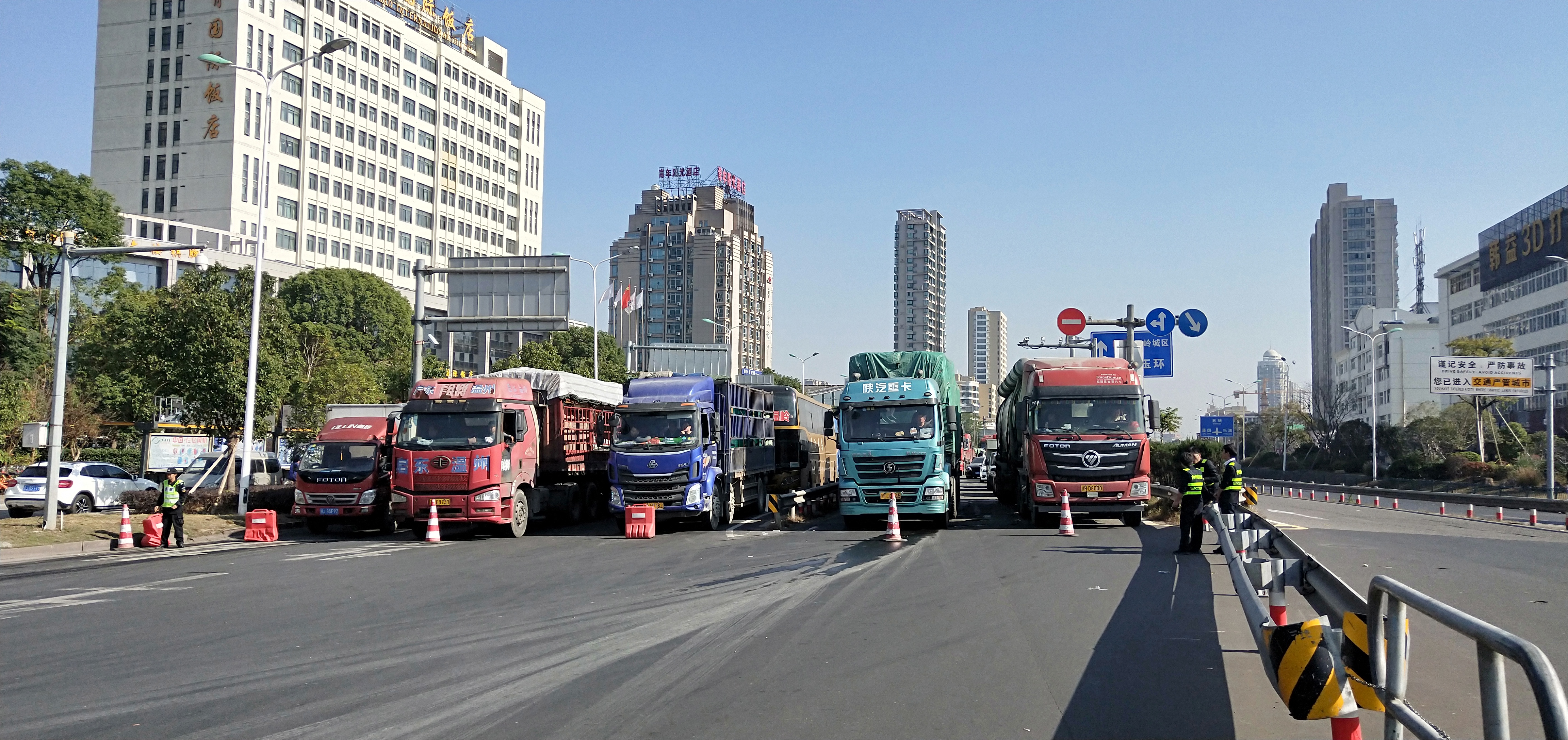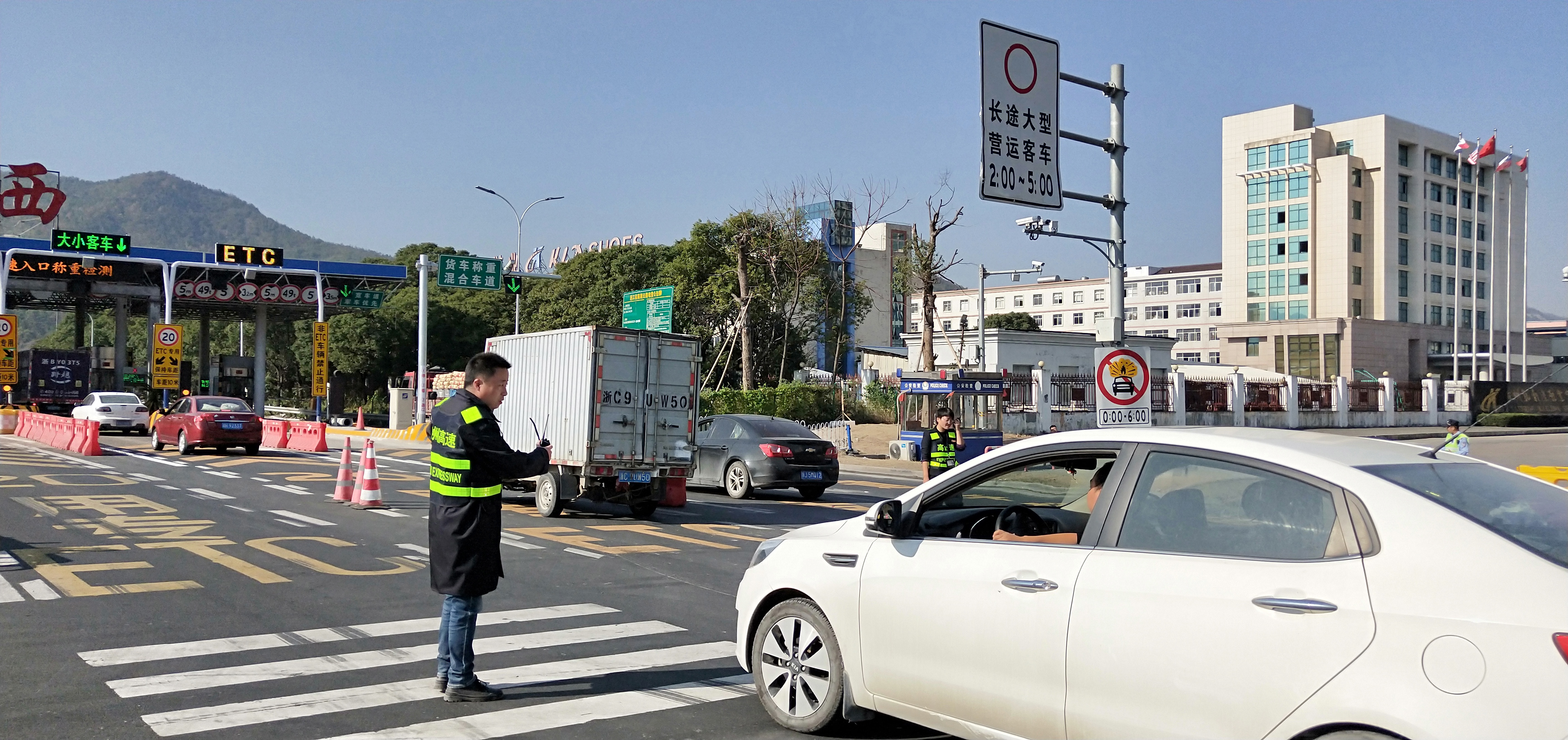 圖為所班子成員帶頭指揮交通 早上8點(diǎn)11分,接到監(jiān)控中心電話:入口開通,開足兩個(gè)人工車道。當(dāng)時(shí)正值新收費(fèi)模式開通前對稱重超限車輛勸返工作的開始。經(jīng)過幾個(gè)小時(shí)封道,此時(shí)的入口車流已經(jīng)一望無際,如果碰到超限車輛,勸返更是難上加難。 在困難中想對策,所領(lǐng)導(dǎo)班子成員提出“輪流式放行”:入口的車輛分別是從橋上和橋下過來,分為4個(gè)車道,每個(gè)車道輪流放行5分鐘,這樣井然有序,不容易造成擁擠和交通事故,并且可以快速放行。每個(gè)車道前都擺放了一個(gè)小紅帽,專人看守。其他人員分別在入口指揮,藍(lán)牌貨車和未安裝ETC的車輛從大小客車車道通行,大貨車從混合車道通行,裝有ETC的客車和集裝箱走ETC專用通道。大家不斷穿梭在車道、廣場之間,向司機(jī)一遍遍耐心解釋,指揮每一輛車順利通行。1名孕婦行動(dòng)不便,被分在監(jiān)控室接聽電話,查詢?nèi)肟跓o信息的車道。所有人一身汗,忙得顧不上喝一口水,臨近飯點(diǎn)也沒有人主動(dòng)去吃飯,大家都頂住壓力,從黎明到黃昏一心想著快速準(zhǔn)確高效放行。