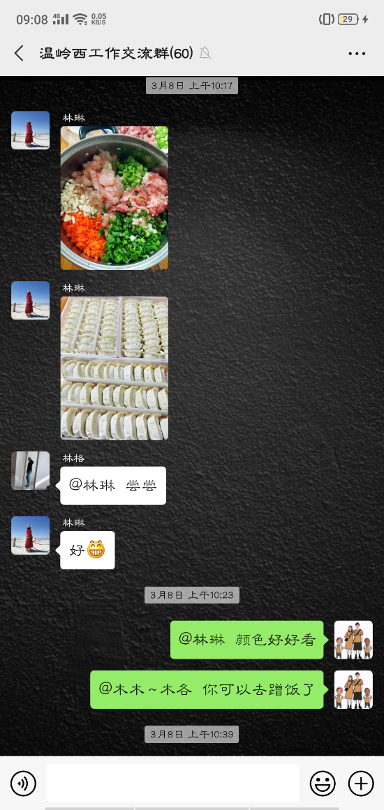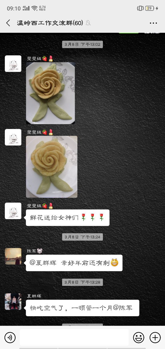 活動(dòng)中,大家的參與性都很高,紛紛在微信群內(nèi)曬出自己制作的美食:鹽焗雞、可樂(lè)雞翅、蔥油角角魚(yú)、溫嶺小吃豬肉飯、玫瑰南瓜饅頭……紛紛亮出了自己的拿手好菜,在群里談?wù)摰脽峄鸪斓耐瑫r(shí),也不忘介紹一下自己做的菜。甚至很多男同事也紛紛曬出自己的最佳廚藝,祝福女同胞節(jié)日快樂(lè)。