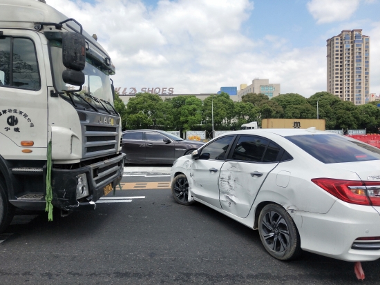 圖為事故現(xiàn)場 聽到巨響,收費員立即上前查看,所幸兩車司機都安好,便立即開啟備用車道,以保證其他車輛通行順暢,并且在事故車輛后方放上小紅帽,告知后方來車及時駛?cè)肫渌嚨?。而兩車司機快速撥打交警電話,并且拍照留證,以最快的速度駛出收費站靠邊等待交警處理。 經(jīng)調(diào)取錄像,查看事故緣由。“真相”竟是集裝箱司機引發(fā)的,該車從杭州寧波方向過來,小轎車司機從溫州方向匝道駛出,由于集裝箱司機下橋時沒有注意右方來車,只顧自己右拐車道,直接頂著轎車開出50多米,所幸未造成人員傷亡。 在此小編提醒大家:在駛?cè)朐训赖臅r候,司機要減速行駛;在選擇出口車道的時候,要仔細查看前后方和左右來車,且不要突然變更車道,否則容易造成車輛之間的親密“接觸”。 只有文明安全行駛,才是對自己和他人最好的保護。 鄭霞霞