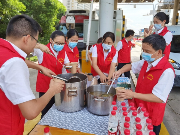在溫嶺西收費(fèi)所進(jìn)出口處,志愿者們身穿紅馬甲,面帶微笑地向途經(jīng)的司乘們遞上一杯杯蓮子湯、紅棗綠豆湯,并溫馨提醒司乘注意疲勞駕駛。 近日,連續(xù)高溫,驕陽(yáng)似火,為進(jìn)一步延伸文明服務(wù),緩解司乘人員暑熱疲勞,臺(tái)州高速溫嶺西收費(fèi)所組織志愿者積極開(kāi)展“炎炎夏日送清涼”活動(dòng),為行駛在路上的廣大司乘送上一份夏日的清涼。