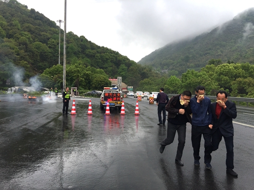 圖為安全有序疏散群眾現(xiàn)場 執(zhí)勤隊緊急出動,趕赴事故現(xiàn)場。“哎呀,著火啦!”事故車上司乘人員呼喊著:“快!快救火!快救人!”一組人員迅速擺放安全警示牌后,快速有序地將滯留群眾疏散到安全位置,另一組人員利用消防水槍滅火,控制事故車輛火情蔓延,值勤隊長根據現(xiàn)場判斷,果斷地通知中控員開啟隧道風機系統(tǒng),對隧道內濃煙進行處理,隨后成功撲滅大火。