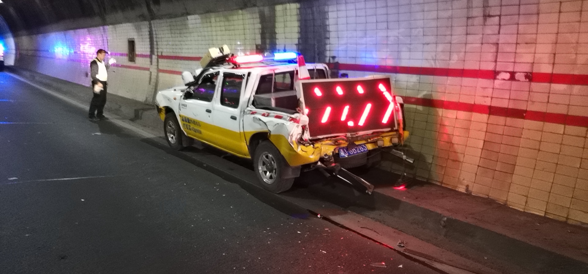 圖為事故車輛 憑著多年積累下來的經(jīng)驗,洪瑞立刻判斷該車肯定存在異常情況,趕緊使用巡邏車內(nèi)的廣播反復(fù)呼叫,提醒貨車靠邊停車檢查,并將此情況反饋到中控室。然而貨車并未停下,為了確保貨車的安全,巡邏車開啟警示燈,拉起警報,給該車預(yù)警。 當車行駛到馬鬃嶺隧道時,執(zhí)勤隊員從后視鏡發(fā)現(xiàn)后方有另一輛大貨車正快速逼近,沒有任何減速的傾向。這一刻,留給他們的只有兩個選擇:往左拐,時間緊張,一個處置不當,會出現(xiàn)尾部被撞后再次追尾前方貨車的前后夾擊險情,后果不堪設(shè)想;或者在被撞時的一瞬間采取正確的應(yīng)對措施,在操作時絕不能有一丁點的遲疑,逃生的時機僅有幾秒鐘。 生死存亡的緊急關(guān)頭,隊員們及其冷靜,被猛烈撞擊時,沒有急踩剎車、誤打方向,在左側(cè)車道有車的情況下,處置正確、分毫不差,往右車道偏移了10來米,成功從夾縫中逃脫,化解了這次險情。巡邏車被撞后,兩名受傷隊員不顧傷痛,仍然堅持下車保護現(xiàn)場并對來往車輛預(yù)警,預(yù)防二次事故的發(fā)生,直到后續(xù)救援力量到達。 此次事故造成三車追尾,兩名執(zhí)勤隊員輕微受傷,雖然巡邏車損失慘重,但是因為執(zhí)勤隊員高度的工作責任心和對險情的正確判斷處置,才未造成任何司乘人員的傷亡,也未影響到隧道正常通行。 據(jù)隧道所員工了解,該貨車司機可能是凌晨疲勞駕駛沒有聽見巡邏車預(yù)警,在此提醒廣大司機,車輛如果發(fā)生故障,車靠邊、人撤離,即報警,切忌疲勞駕駛! 盧祖理