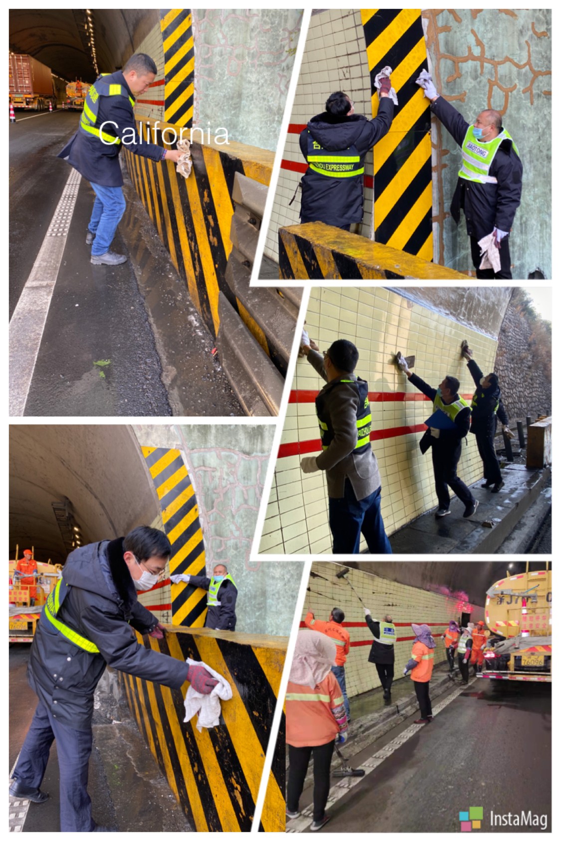 1月14日,黃土嶺隧道所組織黨員志愿者清洗馬鬃嶺隧道。 年關(guān)臨近,馬鬃嶺隧道日流量高達40000多輛,汽車尾氣、揚塵給隧道壁和標志牌等設(shè)施造成了污染,嚴重影響隧道面貌和行車視線。為了提升隧道內(nèi)道路通行環(huán)境,黃土嶺隧道所抓住節(jié)前清洗隧道的良機,與高速交警、養(yǎng)護公司聯(lián)合制定清洗保暢方案,確保隧道清洗順利開展。