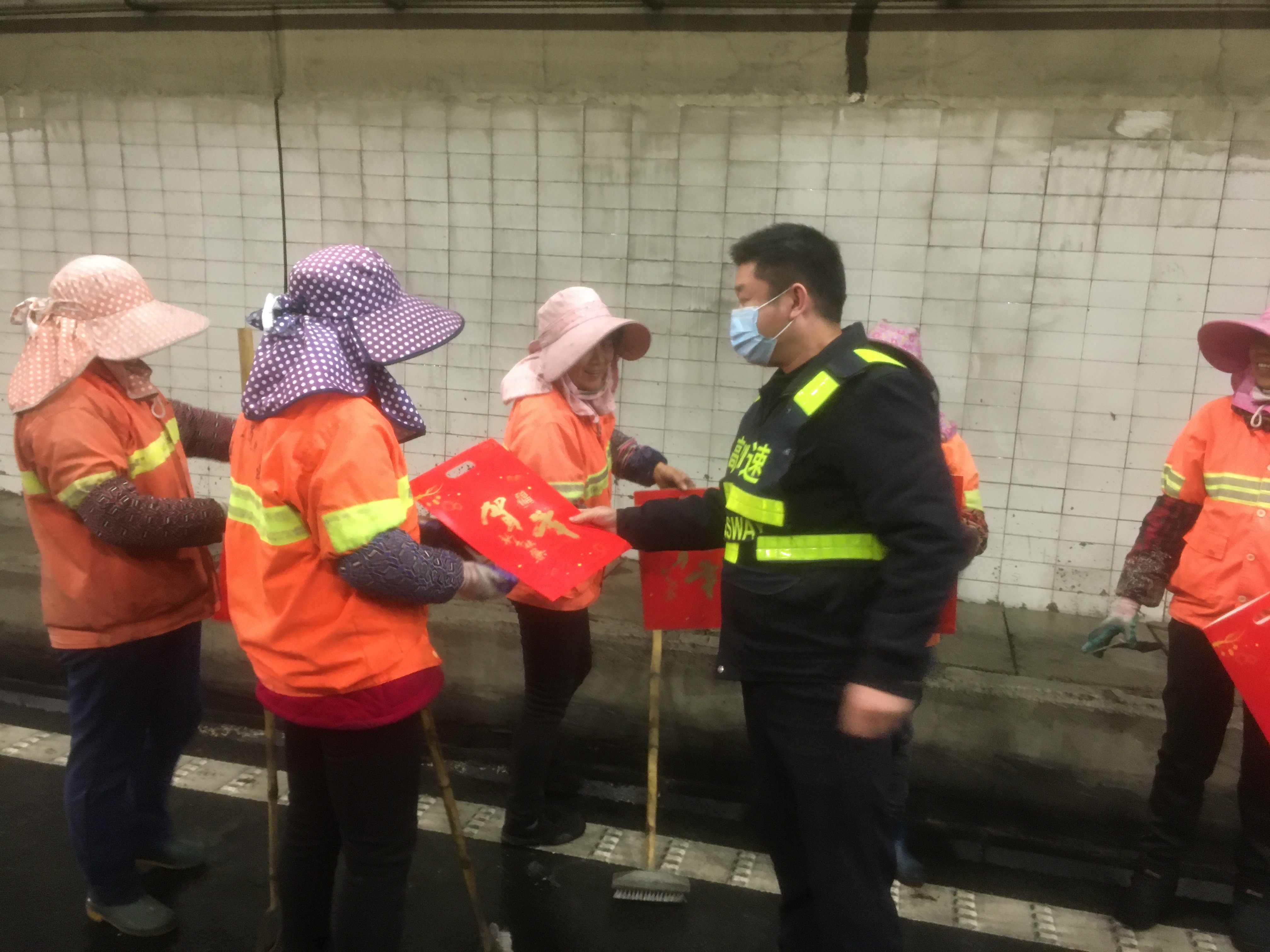 上午十點(diǎn)左右,盧所把工人們迎到食堂,熱情的招呼著大家。當(dāng)班的隊(duì)員們把一碗碗熱乎乎的臘八粥送到養(yǎng)護(hù)工人們的手中,吃著這冬日里的熱粥他們臉上露出了由衷的笑容。 下午,從公司匆匆趕回來的應(yīng)所帶領(lǐng)隊(duì)員們對隧道的清洗情況進(jìn)行了驗(yàn)收,肯定了養(yǎng)護(hù)工人們的勞動(dòng)成果,并表示了親切的慰問,同時(shí)把一幅幅春聯(lián)親自送到了他們的手中。