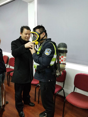 培訓(xùn)中,陶文輝講解了“高速隧道火災(zāi)特點(diǎn)”及呼吸器、防化服的使用方法及相關(guān)要求。話題開(kāi)啟后,隊(duì)員們紛紛參與討論,爭(zhēng)相發(fā)言,講述各自在隧道事故處理中施救和應(yīng)對(duì)的經(jīng)歷與心得,交流平日巡查中所需注意的事項(xiàng),互相提醒工作中的不足,并針對(duì)實(shí)際問(wèn)題提出了許多建設(shè)性意見(jiàn)。同時(shí),在主講人的現(xiàn)場(chǎng)演示下,參訓(xùn)人員逐個(gè)“以身試法”,進(jìn)一步熟悉和掌握了防毒面罩的穿戴方法。