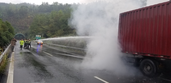 隧道外突發(fā)火情,執(zhí)勤隊火速救援 11月23日上午09:15分,一陣急促的警鈴聲響起,大溪嶺北情報板附近硬路肩有一集裝箱貨車車頭起火,執(zhí)勤三隊隊長剛好在中控室,迅速組織執(zhí)勤隊員趕往現(xiàn)場。