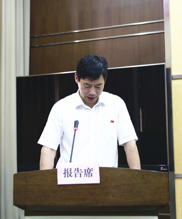 圖為公司副總經(jīng)理陳保衛(wèi)宣讀《關(guān)于轉(zhuǎn)讓臺(tái)州高速泰和房產(chǎn)公司股權(quán)的議案》
