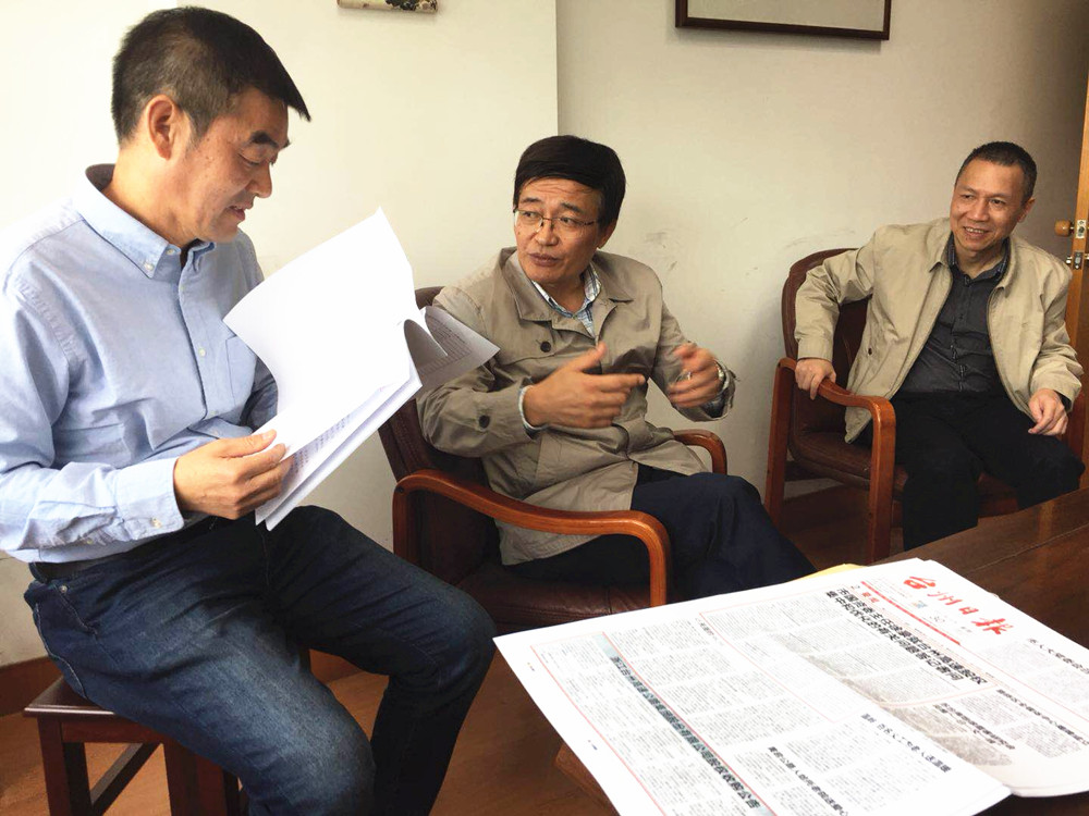 圖為市國資委主任徐豪和集團總經(jīng)理張建平一起走訪市財政局股東單位