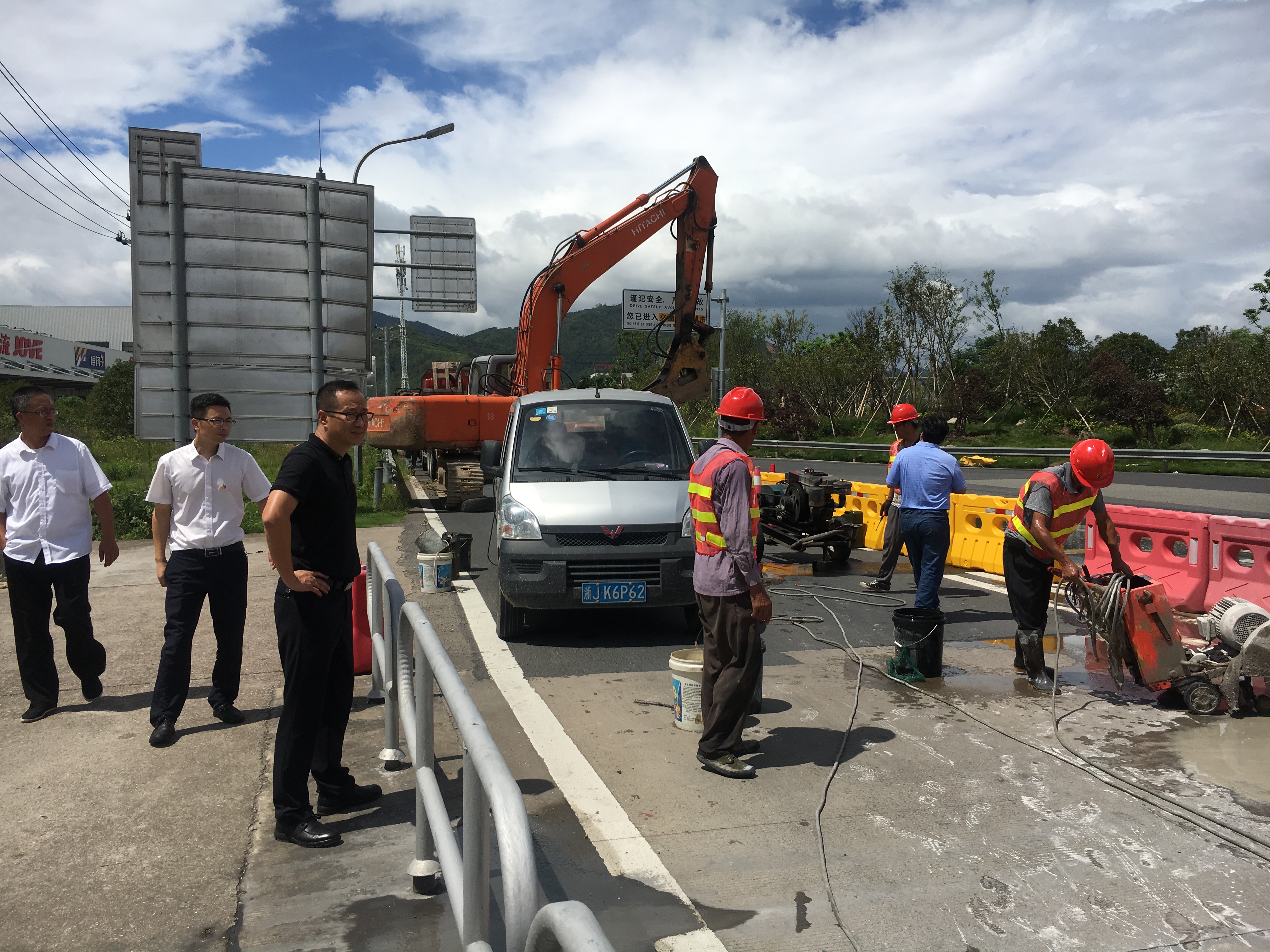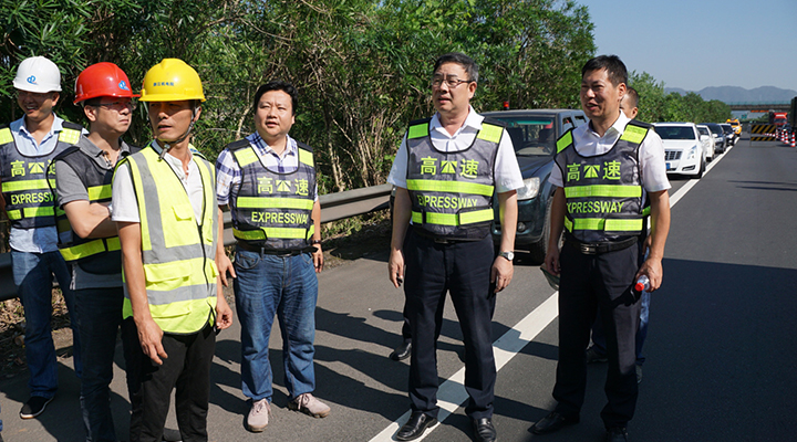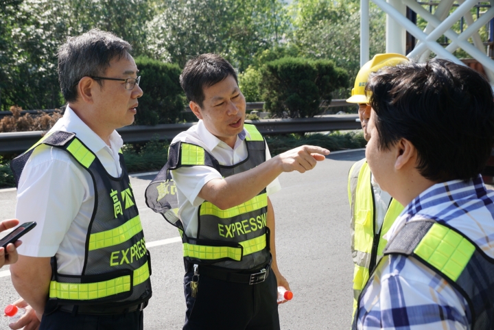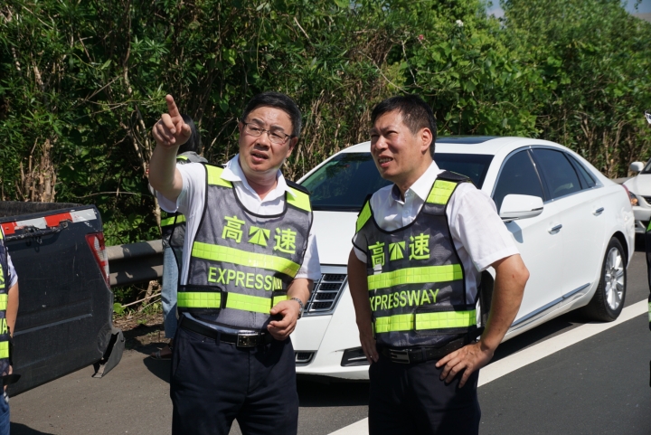 在甬臺溫高速公路臺州段溫州方向主線K1668+200M處現(xiàn)場,陳文波詳細(xì)了解龍門架吊裝的施工工序、取消省界收費(fèi)站總體施工進(jìn)展情況、項目時間節(jié)點(diǎn)、人員班組安排及安全措施準(zhǔn)備情況等。