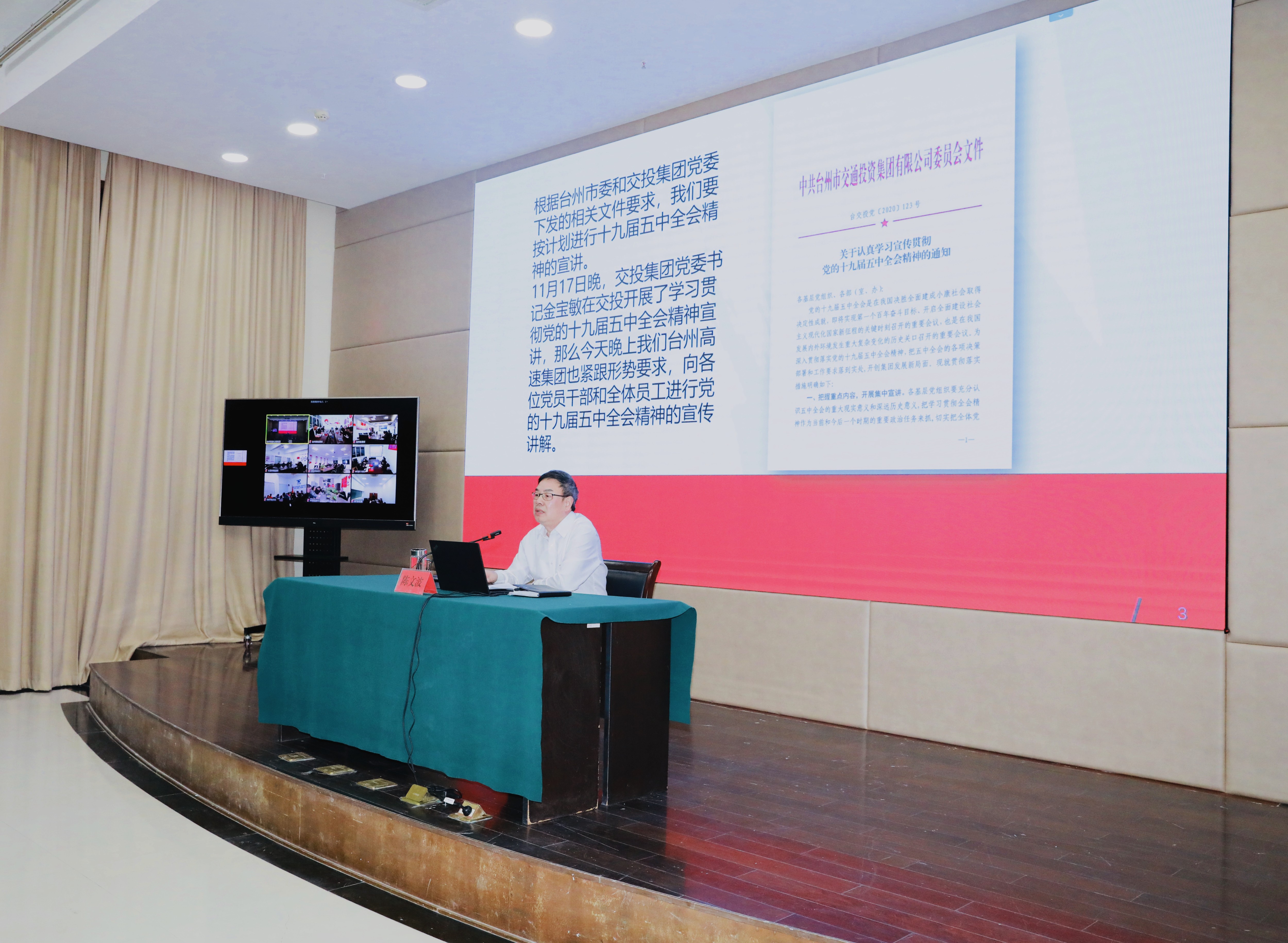 11月23日晚,臺州高速集團黨委書記、董事長、總經(jīng)理陳文波在集團大樓會議室作黨的十九屆五中全會精神宣講報告。集團領導班子成員,各支部書記,大樓全體員工現(xiàn)場參加學習,各所、中心、子公司通過視頻會議系統(tǒng)同步學習。