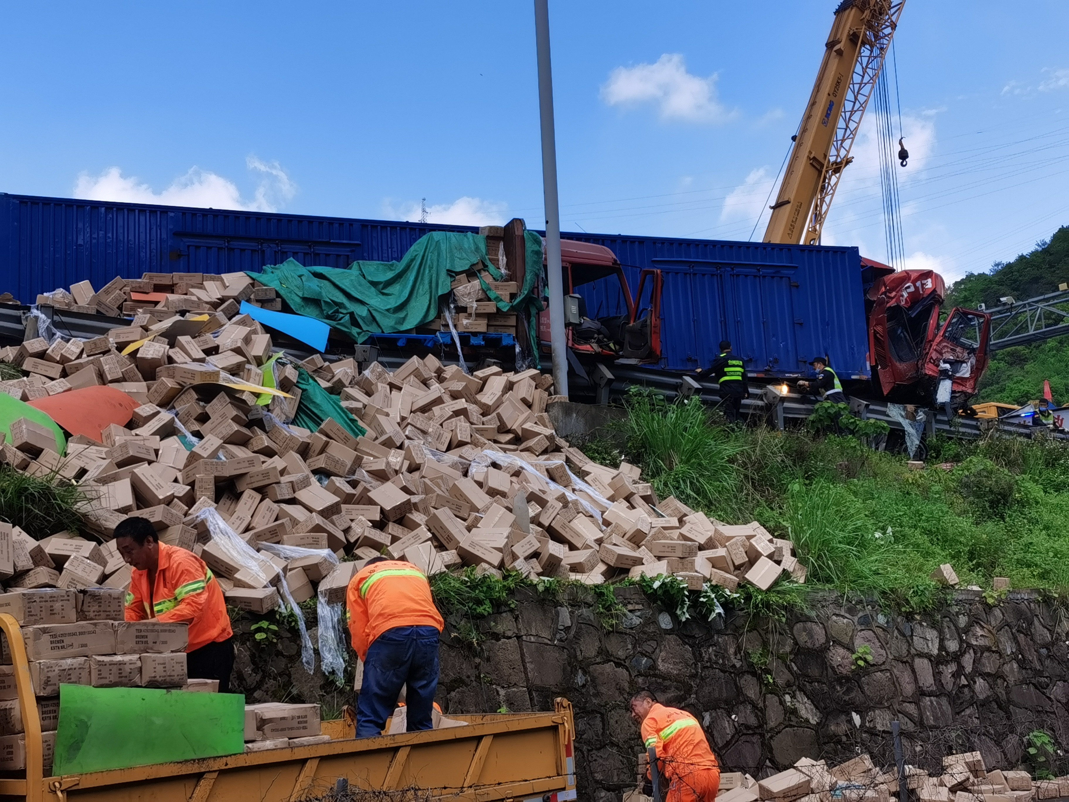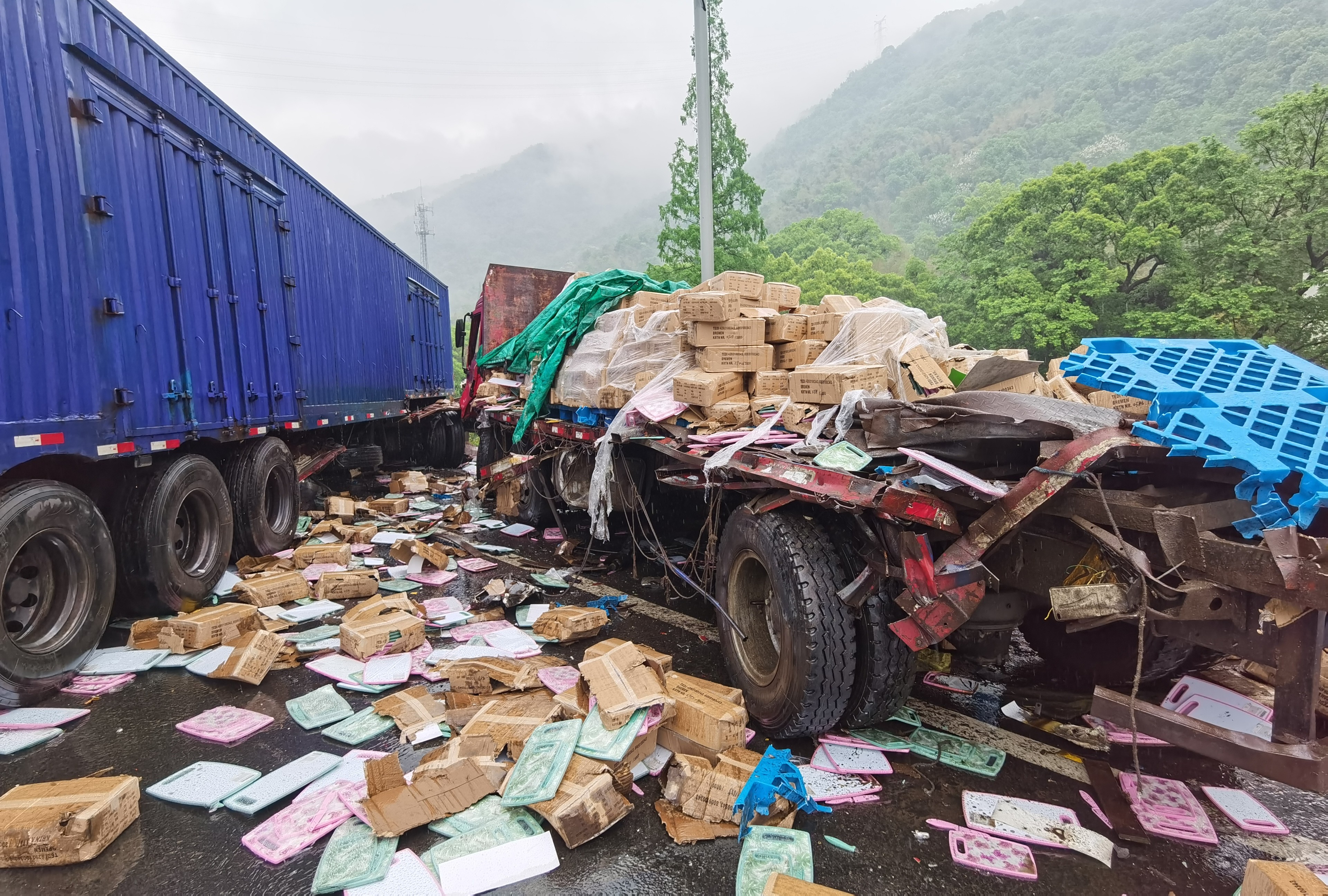 隨后,拖車、救護(hù)車、吊車相繼到達(dá),所有人員立即有序分工,因大貨車車頭卡在護(hù)欄,需要切割,拖車難度較大需要吊車將其拖出,現(xiàn)場(chǎng)救援緊急開展。隧道所工作人員協(xié)助駁貨車清理貨物和散落的車架,保證高速路面通暢。 后經(jīng)詢問(wèn)了解,平板貨車因車輛拋錨停在黃土嶺寧向洞口200米處,雖然已將安全警示牌放在車輛后方,但車輛未完全??窟吷稀:蠓揭惠v箱式貨車發(fā)現(xiàn)時(shí)緊急剎車,由于當(dāng)時(shí)正下大雨路面濕滑,緊急制動(dòng)后車輛發(fā)生擺尾失控,司機(jī)急打方向想要救車阻止,但是依然撞上了前方的拋錨貨車。 再次提醒廣大司乘人員,雨天路滑,要控制車速保持車距離,遇車輛拋錨,車靠邊人撤離,并撥打高速救援電話12122。 蔣弓