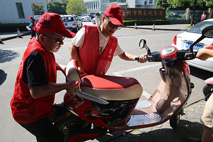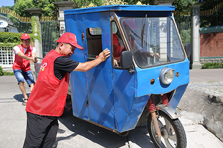 上圖為志愿者服務(wù)隊(duì)合力推離停放不規(guī)范的電瓶車(chē)、三輪車(chē)