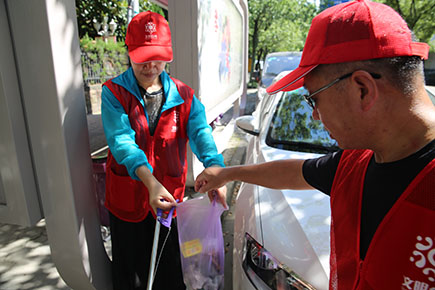 圖為志愿者撿拾垃圾,撕除車(chē)窗上的小卡片
