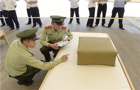 圖為教官為各位選手的“豆腐塊”裁判打分 這是集團(tuán)2018年技能大比武中內(nèi)務(wù)項(xiàng)目比賽中的一個(gè)場(chǎng)景。此次內(nèi)務(wù)比賽由公司大樓、所、中心、子公司共挑出33名代表參加,比賽特邀黃巖消防大隊(duì)兩位教官擔(dān)任裁判。