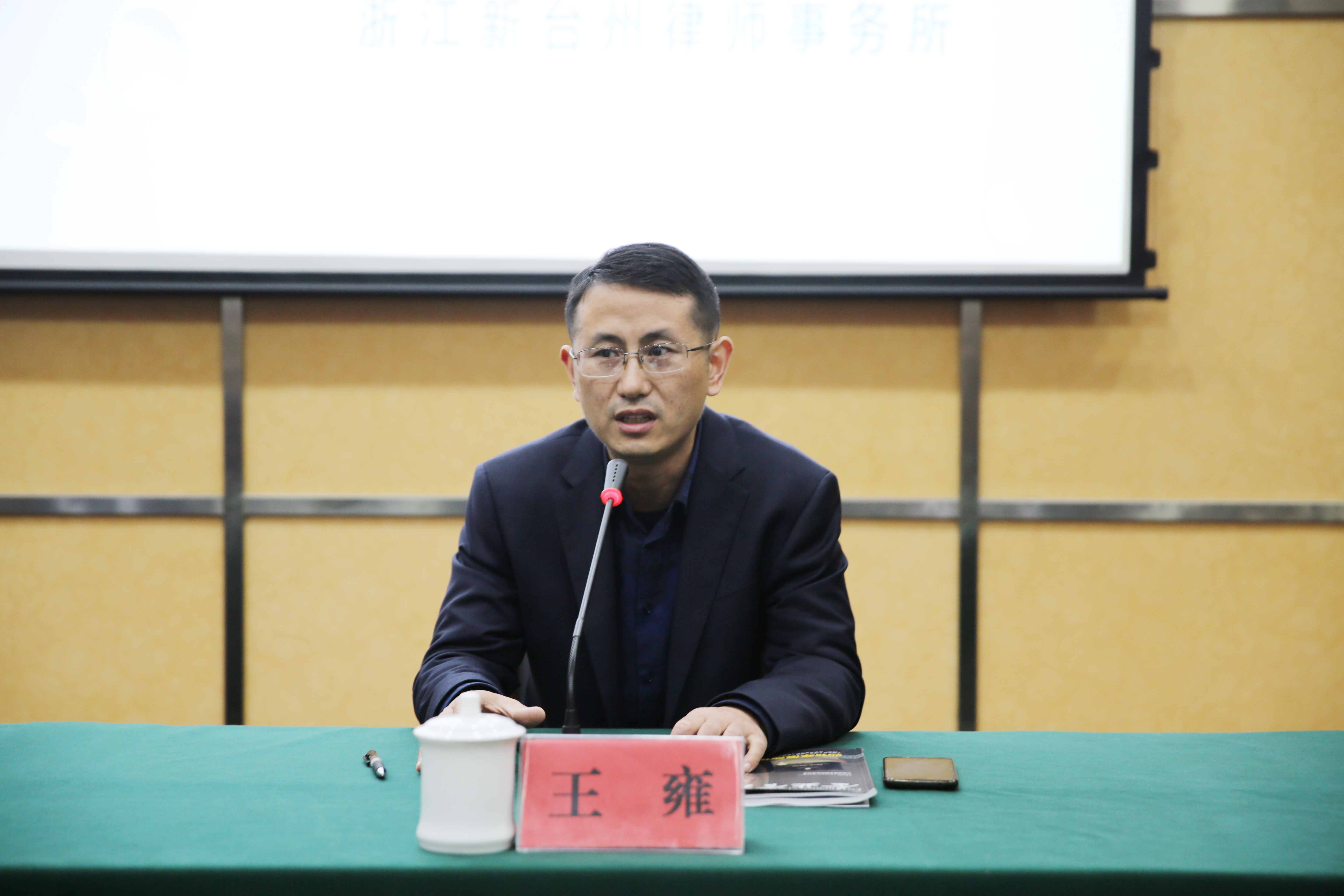 圖為王雍主持培訓會 本次培訓會邀請了浙江新臺州律師事務所律師程龍為大家授課。程龍結合實際案例對最新的九民紀要進行解讀,并講解了有關集團提供擔保、股東代表訴訟、表決權能否受限、借款合同等相關法律知識,還對可能存在的的風險,及可能引發(fā)的民事責任、行政責任和刑事責任等進行相應的介紹。