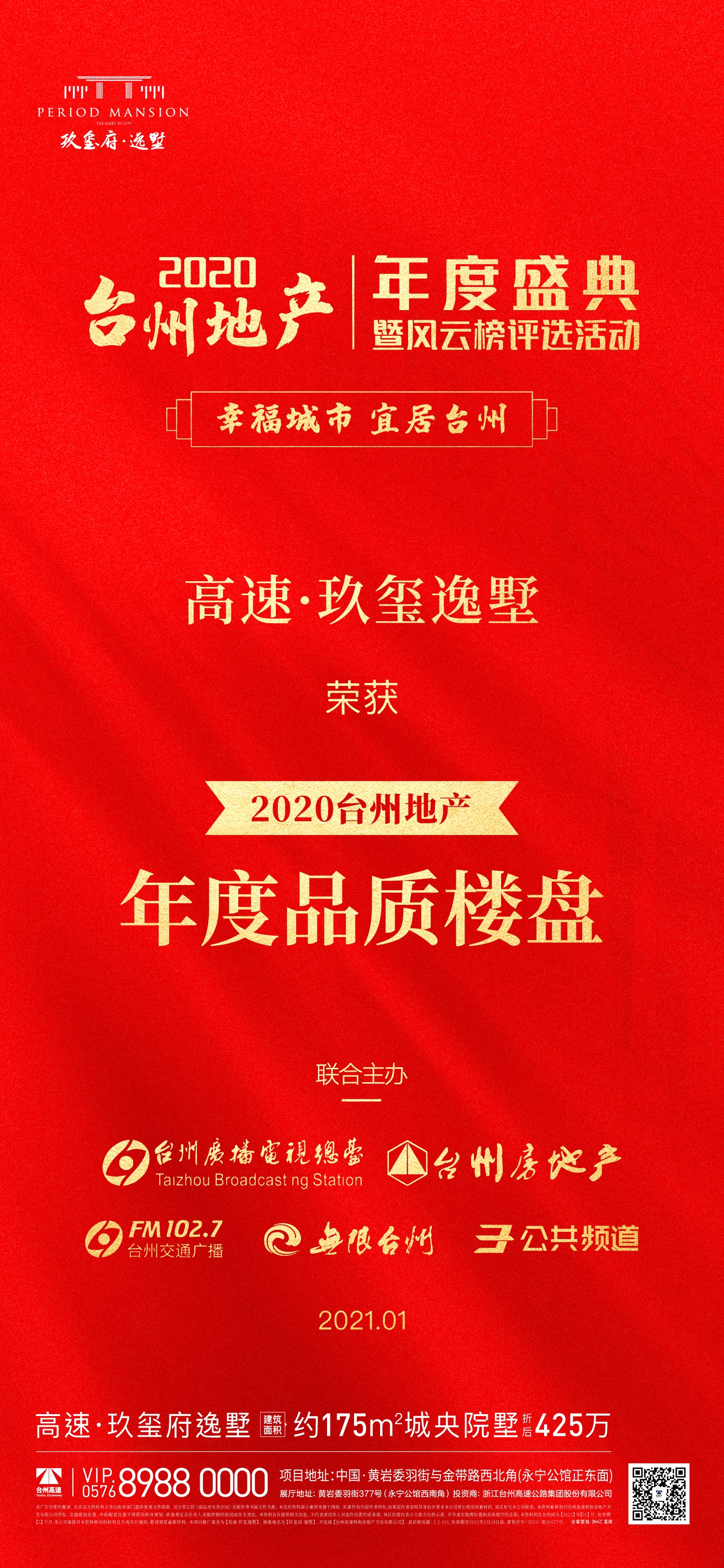 2021年1月19日下午,由臺州廣播電影電視集團(tuán)聯(lián)合臺州市房地產(chǎn)業(yè)協(xié)會共同舉辦的2020臺州地產(chǎn)年度盛典暨臺州地產(chǎn)風(fēng)云榜,在全城熱矚下重磅舉行。高速房產(chǎn)玖璽府·逸墅項目榮獲“2020臺州地產(chǎn)年度品質(zhì)樓盤”榮譽(yù)稱號。
