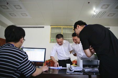 圖為集團(tuán)副董事長、總經(jīng)理張建平在臨海股權(quán)收購點(diǎn)檢查工作人員業(yè)務(wù)操作