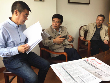 圖為市國資委主任徐豪和集團(tuán)總經(jīng)理張建平一起走訪市財(cái)政局股東單位