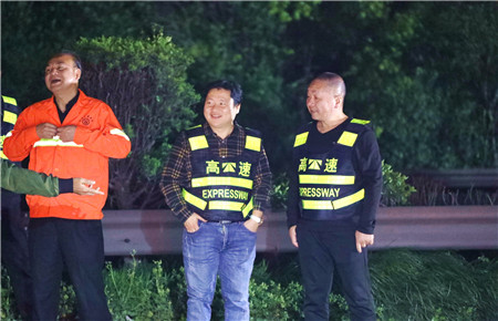 圖為工程養(yǎng)護(hù)部經(jīng)理何翔堅(jiān)守在夜間封道施工現(xiàn)場(chǎng)