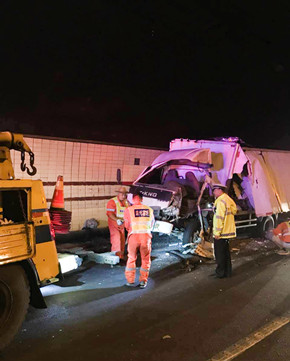 這輛“始作俑者”的車輛由于司機(jī)疲勞駕駛,不慎撞擊隧道壁而引發(fā)側(cè)翻,雖然該車內(nèi)無人員受傷,可是跟隨其后的拖掛車就沒那么幸運(yùn)。拖掛車司機(jī)看到前方出狀況,當(dāng)即采取緊急制動,剎得太急又致使后方小貨車追尾,導(dǎo)致該車車頭嚴(yán)重受損,司機(jī)的手臂受了傷,運(yùn)輸?shù)匿X塊也撒了一地。