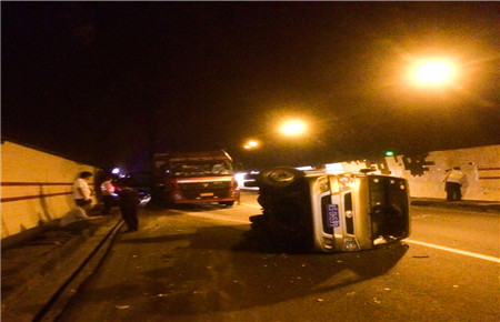 兩起事故的接連發(fā)生使救援工作緊張。2分鐘后,執(zhí)勤隊火速趕到了事故現(xiàn)場,為了以最短時間恢復(fù)正常通行,隊長謝永濱決定兵分兩組,一組自己帶隊對第二起事故立即進(jìn)行處理,讓輕微擦傷的三輛事故車先撤離現(xiàn)場,在下個出口等待交警處置,并向監(jiān)控中心通知需拖車前來施救,與此同時加強(qiáng)預(yù)警,快速疏導(dǎo)交通。另一組由執(zhí)勤隊員跑步前進(jìn)查看事故現(xiàn)場,了解車輛情況。經(jīng)查看,該貨車因爆胎導(dǎo)致撞車,所幸側(cè)翻事故未造成人員傷亡。在各部門的通力配合下,一個小時后,事故現(xiàn)場清理完畢,隧道恢復(fù)了正常通行。