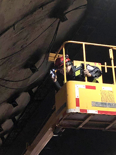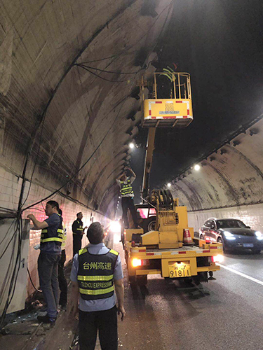 圖為各方人員集聚商討搶修方案 黃土嶺隧道所立即啟動應(yīng)急搶修預(yù)案,聯(lián)合高速交警、工程養(yǎng)護部、施救中心展開緊急搶修工作?,F(xiàn)場,各方人員集聚商討搶修方案、檢查安全措施、布置搶修作業(yè)。登高車上,黃土嶺隧道所執(zhí)勤二隊隊長林朝波等一批搶修人員率先清理斷落的電纜,調(diào)整接線、緊固螺栓……各項工作環(huán)環(huán)緊扣,緊張而有序。