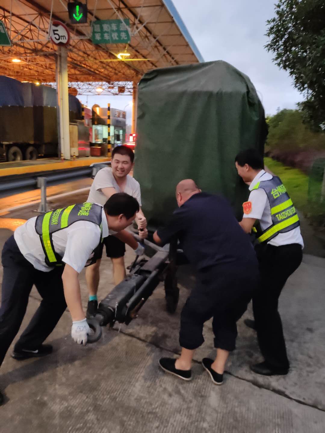 因故障涉及外網(wǎng)高壓供配電,維養(yǎng)中心緊急啟動應(yīng)急預(yù)案,一邊聯(lián)系黃巖供電部門將10KV高壓進(jìn)線斷開,以確保搶修人員人身安全,一邊求助施救中心將停在臺州所的移動發(fā)電機(jī)拉至臺州南收費(fèi)所。但由于該站站房轉(zhuǎn)角偏小,拖車無法進(jìn)入,大家便一起合力將重達(dá)十幾噸發(fā)電機(jī)手推至配電房外側(cè),以備不時(shí)之需。