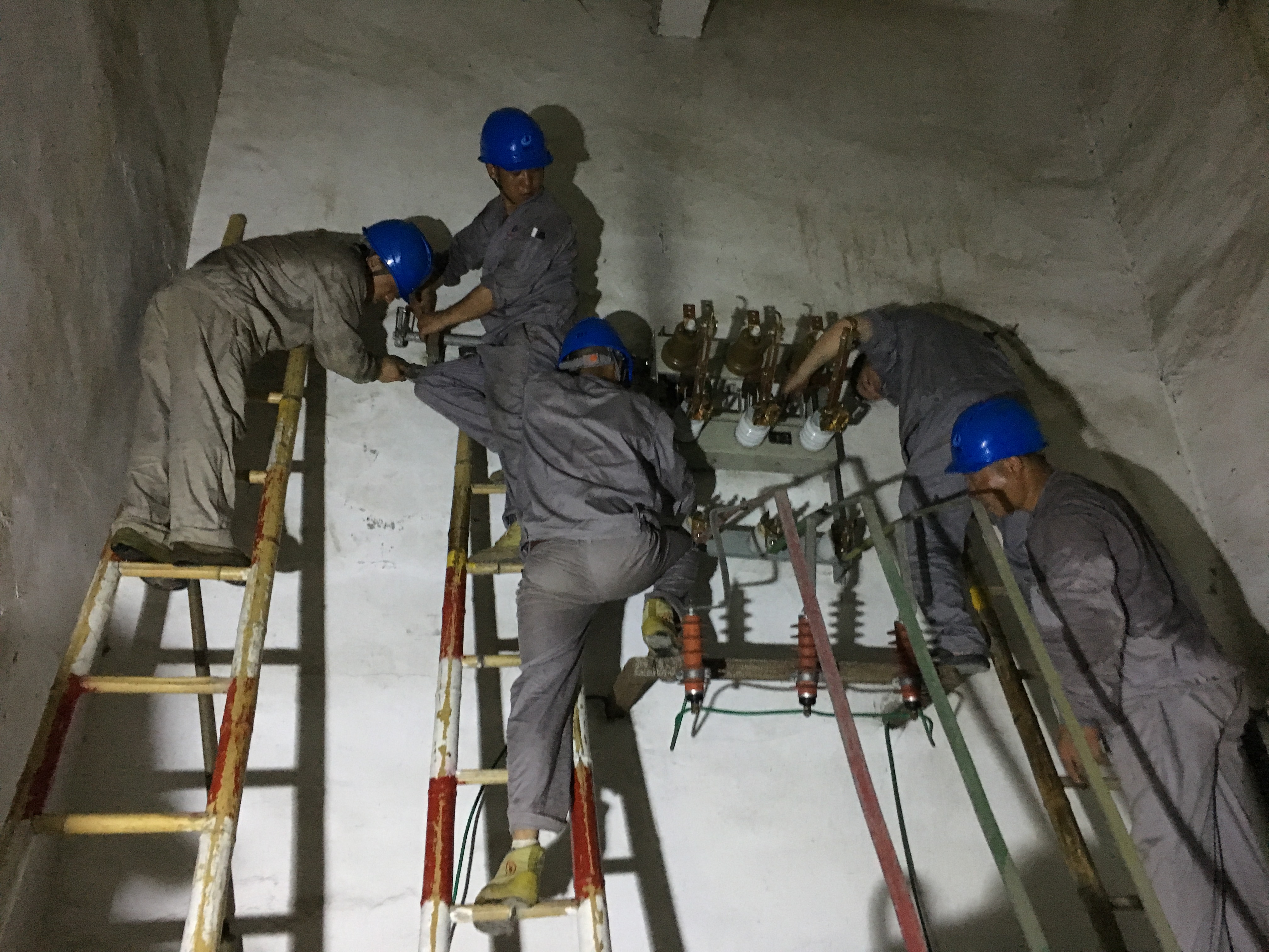 19點(diǎn)40分,高壓負(fù)荷開關(guān)到位。搶修人員安照各自的分工,掛接地電阻、拆卸舊件、重做高壓電纜接頭、安裝新跌落熔絲......就在大家以為快要完工時(shí),卻發(fā)現(xiàn)新開關(guān)的聯(lián)動拉桿接口要略大于舊桿,任憑搶修人員如何用力都無法與底下操作桿連接,但大家并沒有放棄,而是用磨光機(jī)一點(diǎn)點(diǎn)打磨,一次次試驗(yàn),在損耗了兩張磨光片后終于將兩桿順利連接。之后,大家再一鼓作氣,將調(diào)試好的負(fù)荷開關(guān)固定在離地面3米之高的墻上,并成功連接電纜。