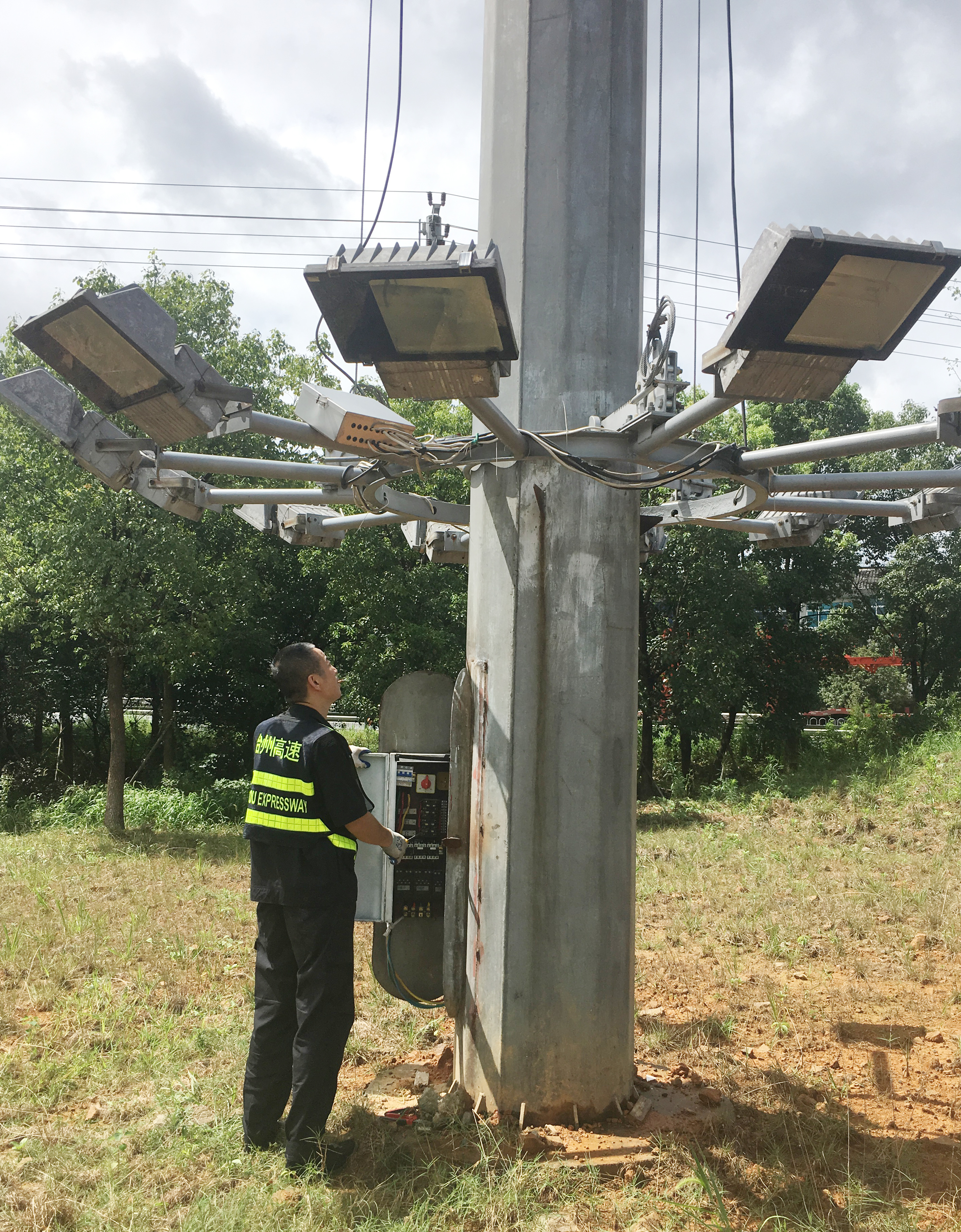 圖為工作人員清除收費頂棚垃圾 及時下降各收費所互通區(qū)高桿燈。為提升互通區(qū)照明亮度,減少因選錯路口而帶來的不必要的麻煩,集團在各收費站出入口互通區(qū)共安裝了11盞40米高度高桿燈,每盞高桿燈上方有12盞鈉燈。倘若這些高桿燈上鈉燈在臺風襲擊下一旦掉落后果將不勘設想。8月8日,中心再次召集各班人員對收費沿線高桿燈進行了下降處理。因高桿燈四周雜草叢生,在下降時維修隊員不僅要忍受底下蚊蟲肆意叮咬,還要克服時而烈日時而大雨的怪異天氣,沒放幾盞隊員便濕透了全身,衣服是濕了又干,干了再濕。