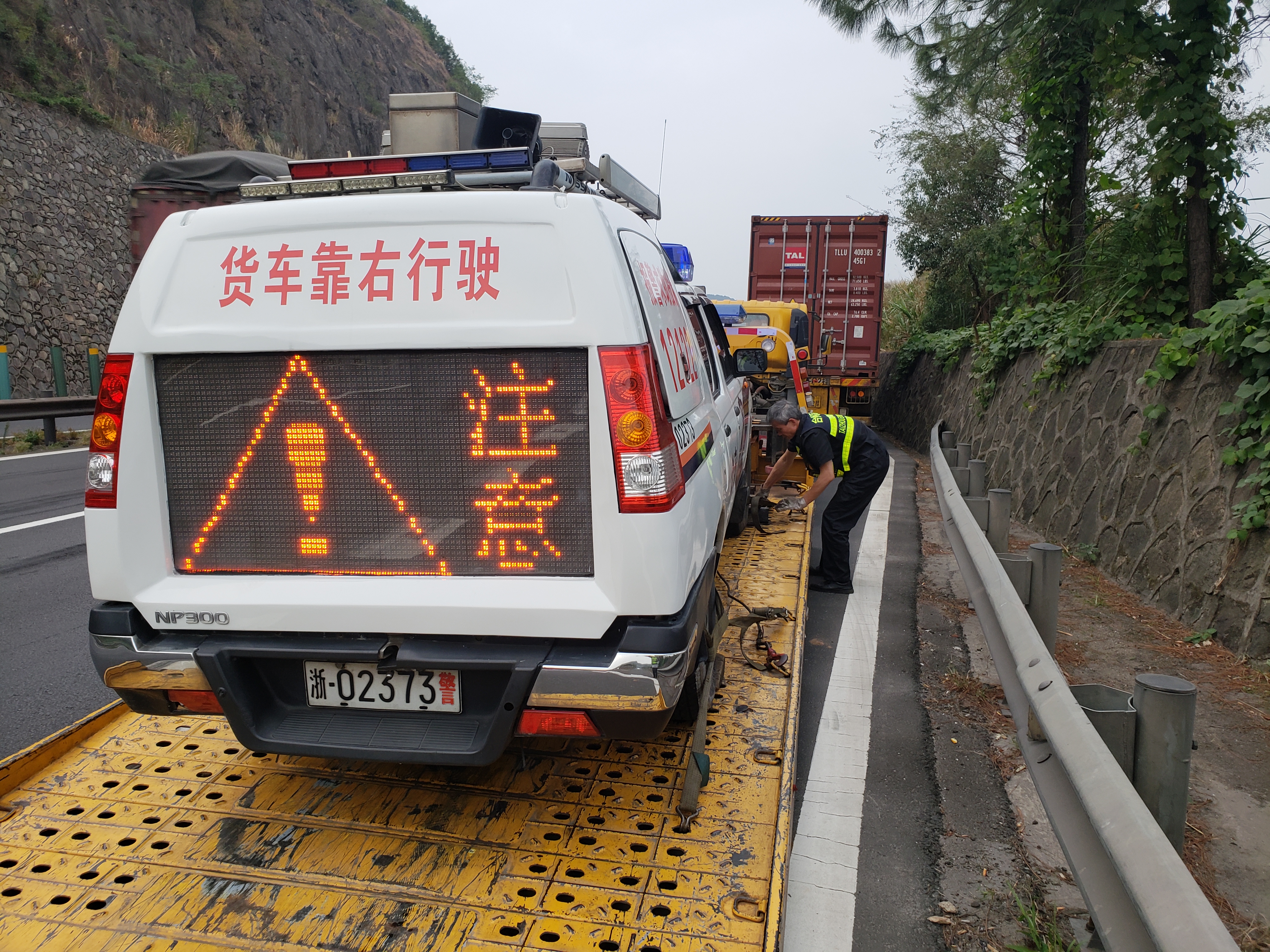 巧合的是,當(dāng)天下午四點(diǎn),這里曾在救援中幫助過施救中心的警車因?yàn)檩喬ス收?,被迫停在寧向黃土嶺外的緊急停車帶上,又是兩人將該車平安救下高速。