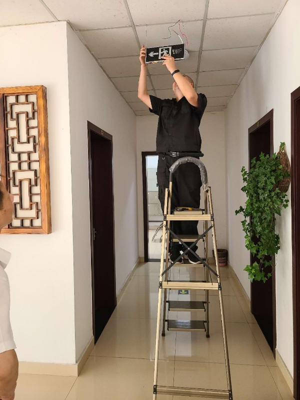 圖為技術(shù)人員安裝現(xiàn)場(chǎng) 在得知這一情況后,維養(yǎng)中心積極協(xié)助收費(fèi)站所購(gòu)買(mǎi)相關(guān)的主材及配件,并主動(dòng)承擔(dān)了這些設(shè)備安裝工作。由于設(shè)備安裝位置很多沒(méi)有直接可用電源,中心技術(shù)員們就從四五米外甚至更遠(yuǎn)的地方,一路套管放線過(guò)來(lái)取電,并用電錘等工具為其開(kāi)孔固定,最后再完成接線送電。經(jīng)過(guò)2天努力,這些帶有方向提示標(biāo)識(shí)、安全出口標(biāo)識(shí)的燈牌被安裝在各層樓梯出口、拐角或主要通道上,因全部帶有儲(chǔ)電功能,即便在斷電的情況下也能發(fā)光發(fā)亮。