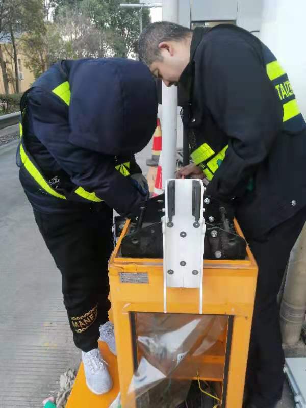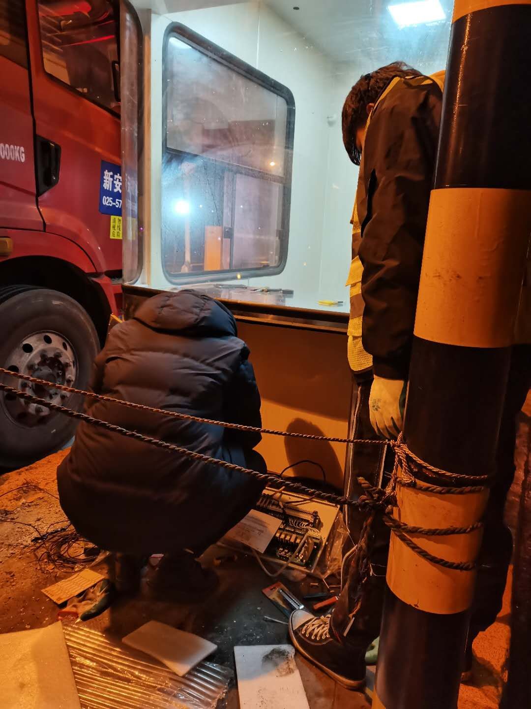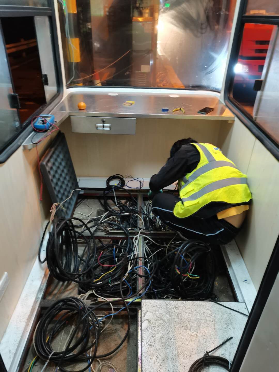 21日下午4點左右,訂購的新崗?fù)ず蛽p壞的設(shè)備設(shè)施陸續(xù)到位,中心值班人員協(xié)同設(shè)備廠家一起將其安放并固定至車道原位置。因崗?fù)A倒時拉斷了底下很多線纜,在拆除設(shè)備時又因為緊急搶修需要沒有作相應(yīng)標(biāo)注,現(xiàn)場各種電線接頭雜亂如麻。考慮到夜間查線、接線存在一定的安全隱患,也不利于施工,搶修人員決定第二天再戰(zhàn)。