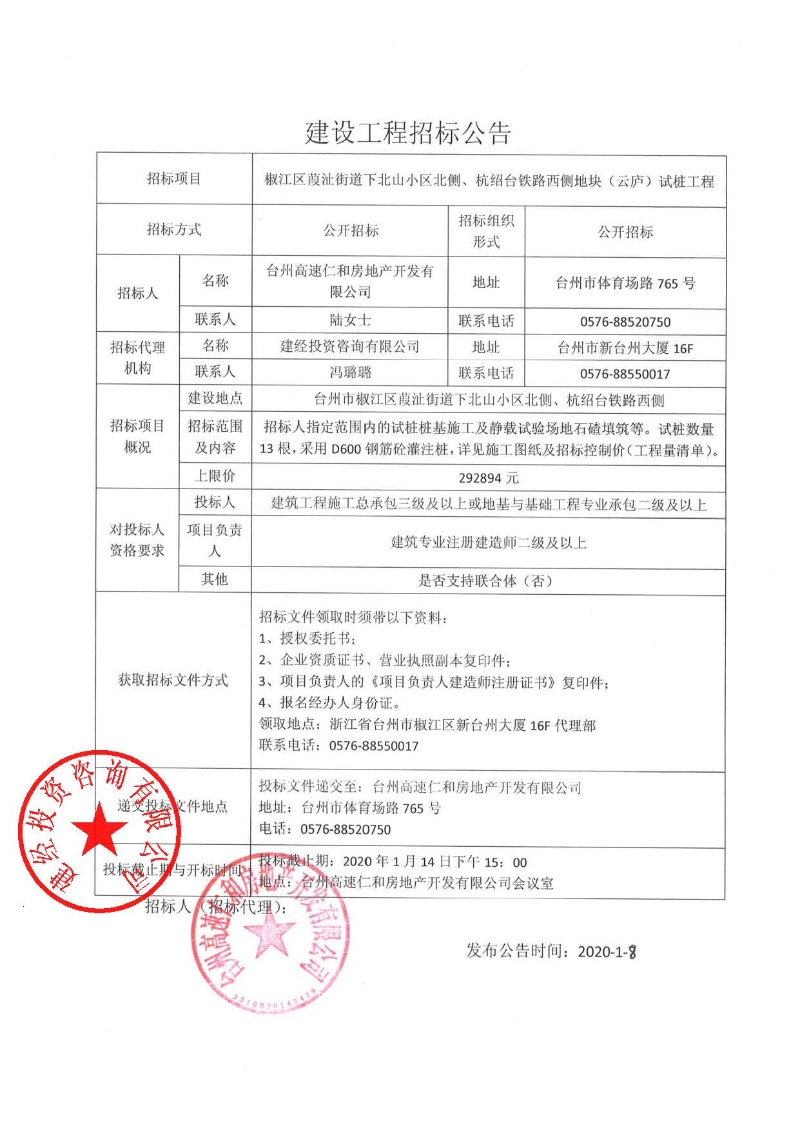 椒江區(qū)葭沚街道下北山小區(qū)北側(cè)、杭紹臺鐵路西側(cè)地塊(云廬)試樁工程招標公告