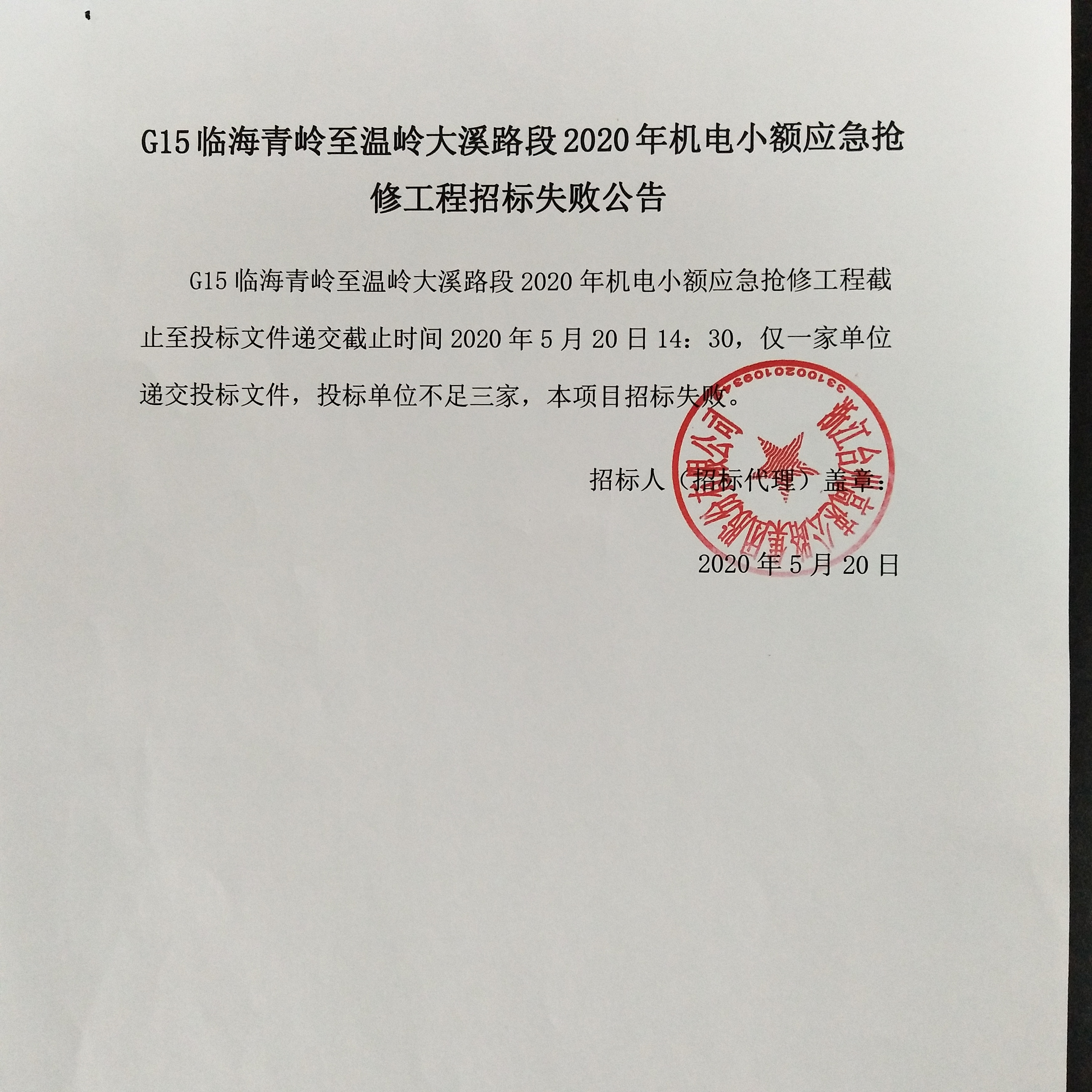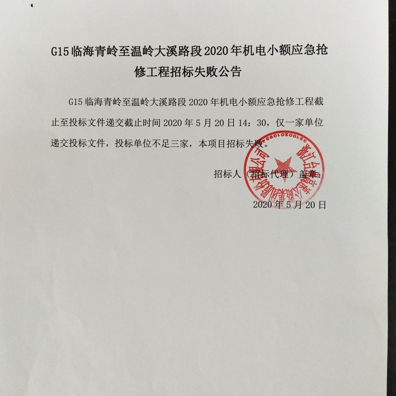 G15臨海青嶺至溫嶺大溪路段2020年機電小額應(yīng)急搶修工程招標失敗公告