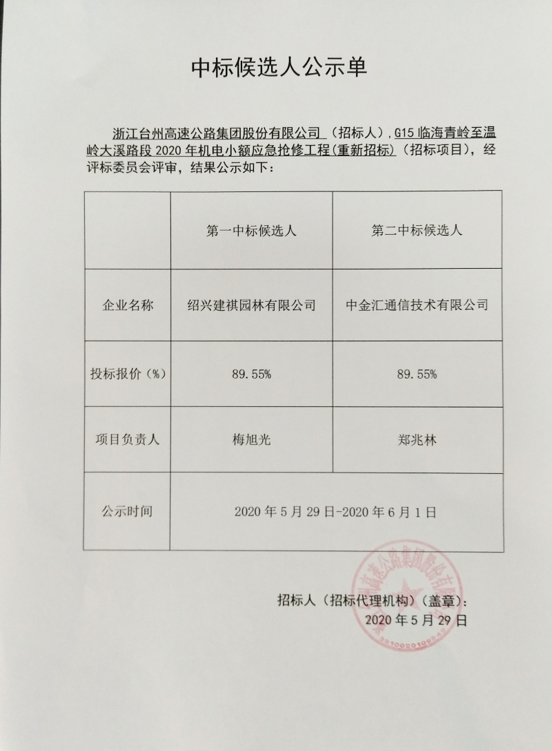 G15臨海青嶺至溫嶺大溪路段2020年機電小額應(yīng)急搶修工程(重新招標(biāo))中標(biāo)候選人公示單